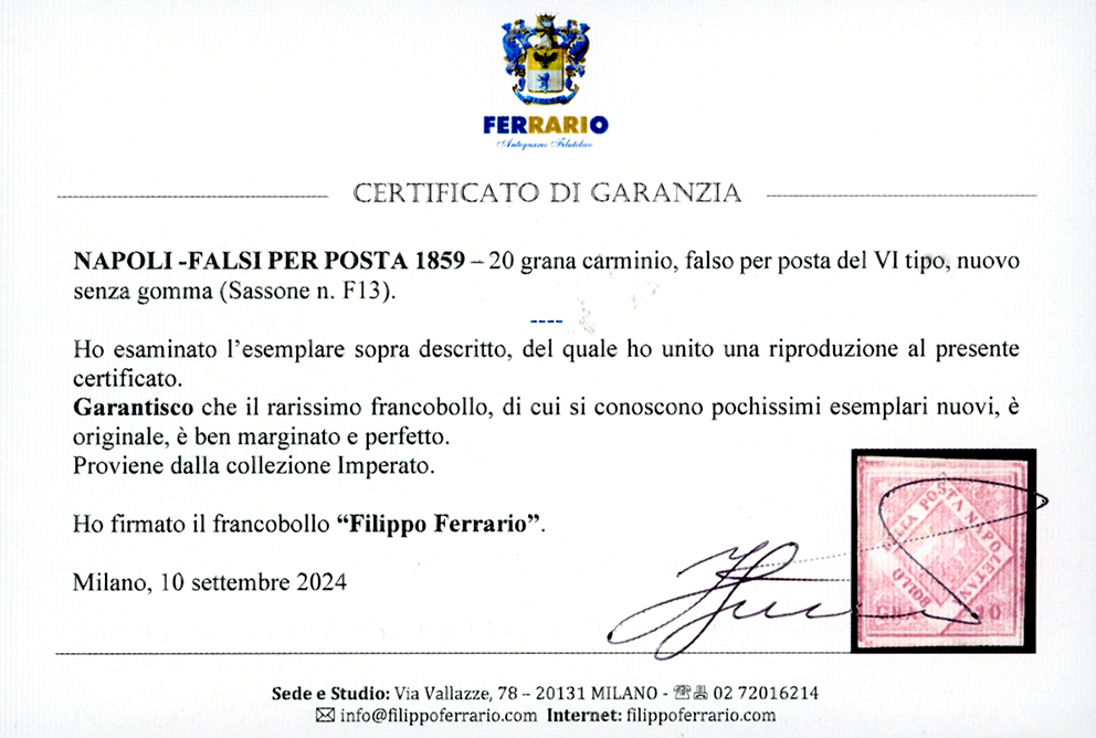 1859 - 20 grana carminio, falso per posta, VI tipo (F13), nuovo senza gomma, ben marginato, ottimo stato. Molto raro, pochissimi esistenti ... Leggi tutto