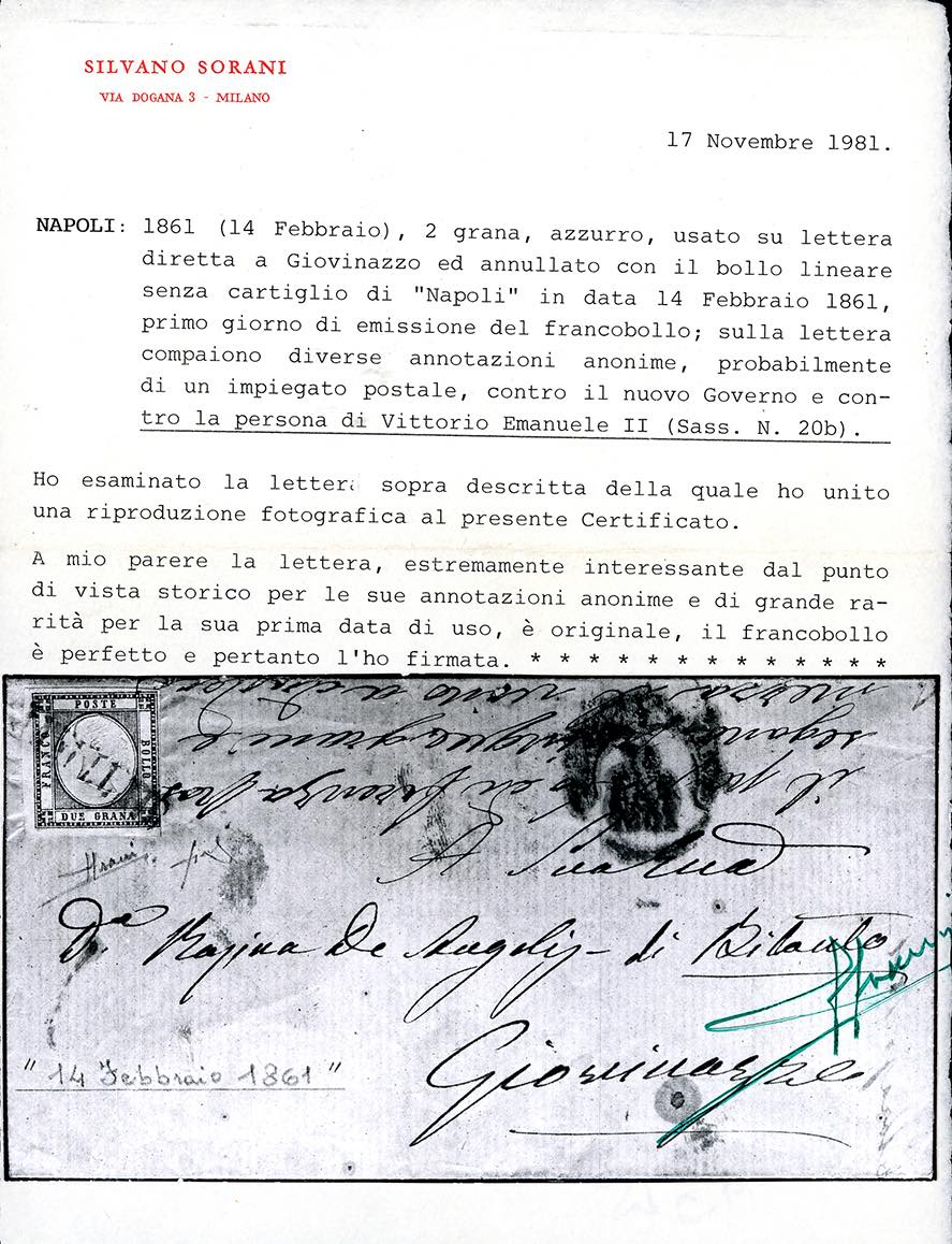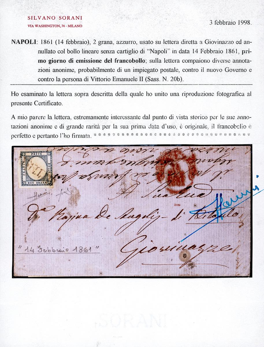 14 FEBBRAIO 1861 - PRIMO GIORNO D'EMISSIONE - 2 grana azzurro (20b), perfetto, su fresca lettera completa del testo interno, bollo "ANNULLATO" lineare, non in cartella, che annulla il francobollo e "PARTENZA DA NAPOLI 14 FEB.1861" rosso al recto, diretta a Giovinazzo. Si conoscono pochissime lettere del primo giorno d'emissione, questa ha il pregio di avere il francobollo perfetto ed un insolito bollo annullatore. INSIEME UNICO E RARITA' DELLE PROVINCE NAPOLETANE. Cert. Fiecchi, Sorani e Ferrario.