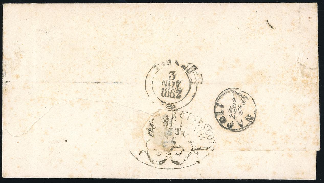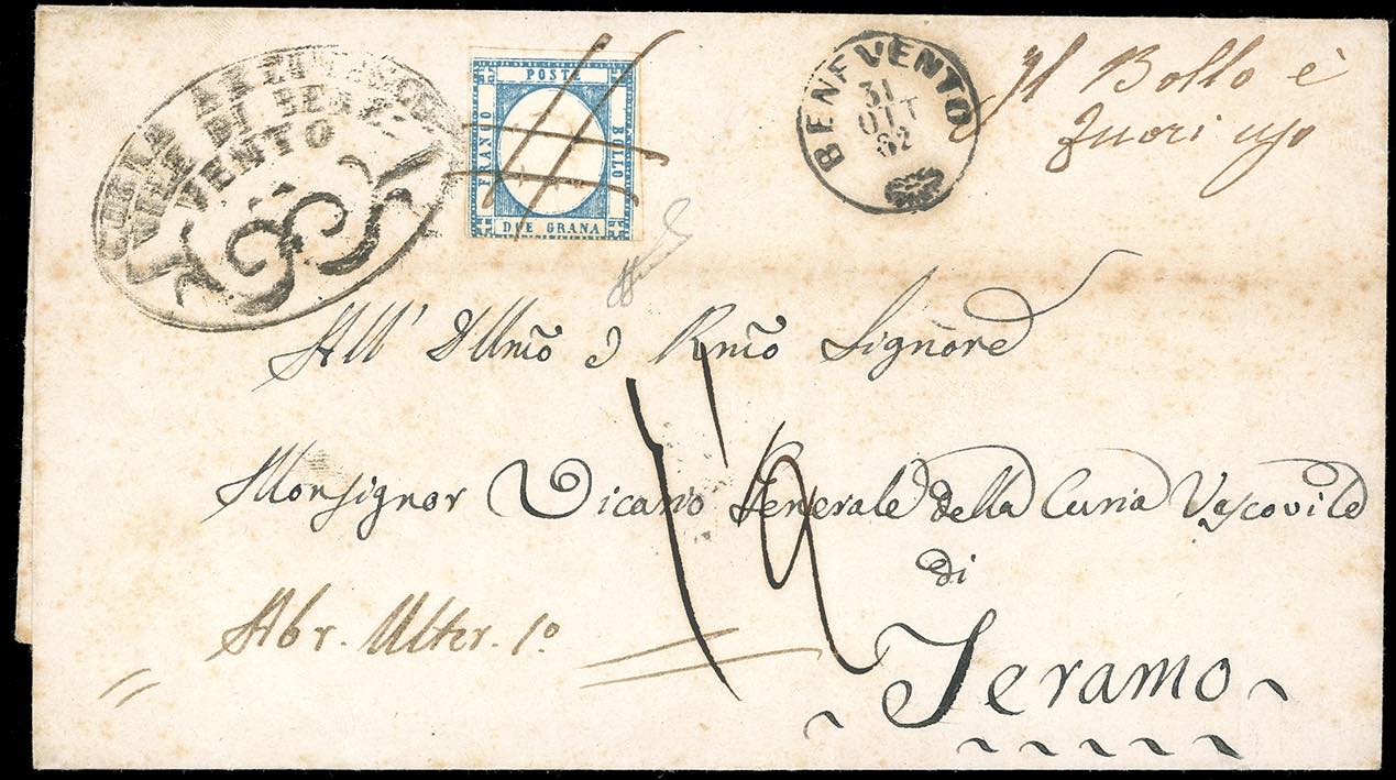 1862 - 2 grana celeste (20a), leggermente intaccato in basso, su lettera da Benevento 31/10/1862 a Teramo. Il francobollo, utilizzato successivamente al proprio periodo di validità, non venne ritenuto valido, venne cassato a penna e sul fronte vennero manoscritti "Il bollo è fuori uso" e la tassa 1 1/2. Insieme interessante e raro. Ferrario.