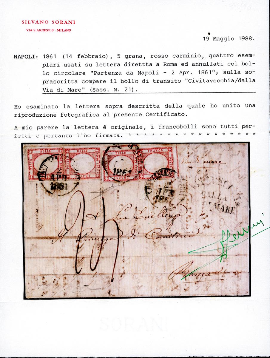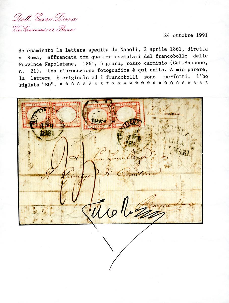 1861 - 5 grana rosso carminio (21), quattro esemplari, perfetti, su lettera da Napoli 2/4/1861 a Roma, tassata 24 baj, sul fronte bollo della via di mare di Civitavecchia. Affrancatura multipla monovalore estremamente rara. Cert. E.Diena e Sorani.