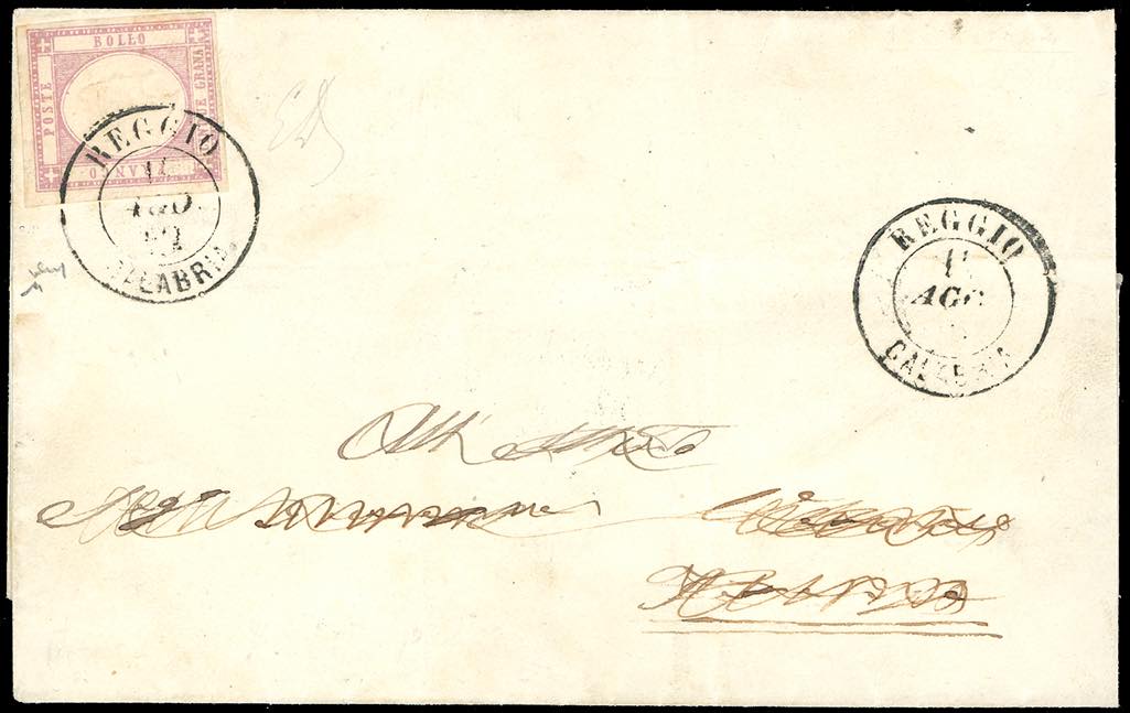 1862 - 5 grana rosa lilla (21b), perfetto e ben marginato, su lettera da Reggio Calabria 14/8/1862 a Firenze, al verso transito di Messina. ... Leggi tutto