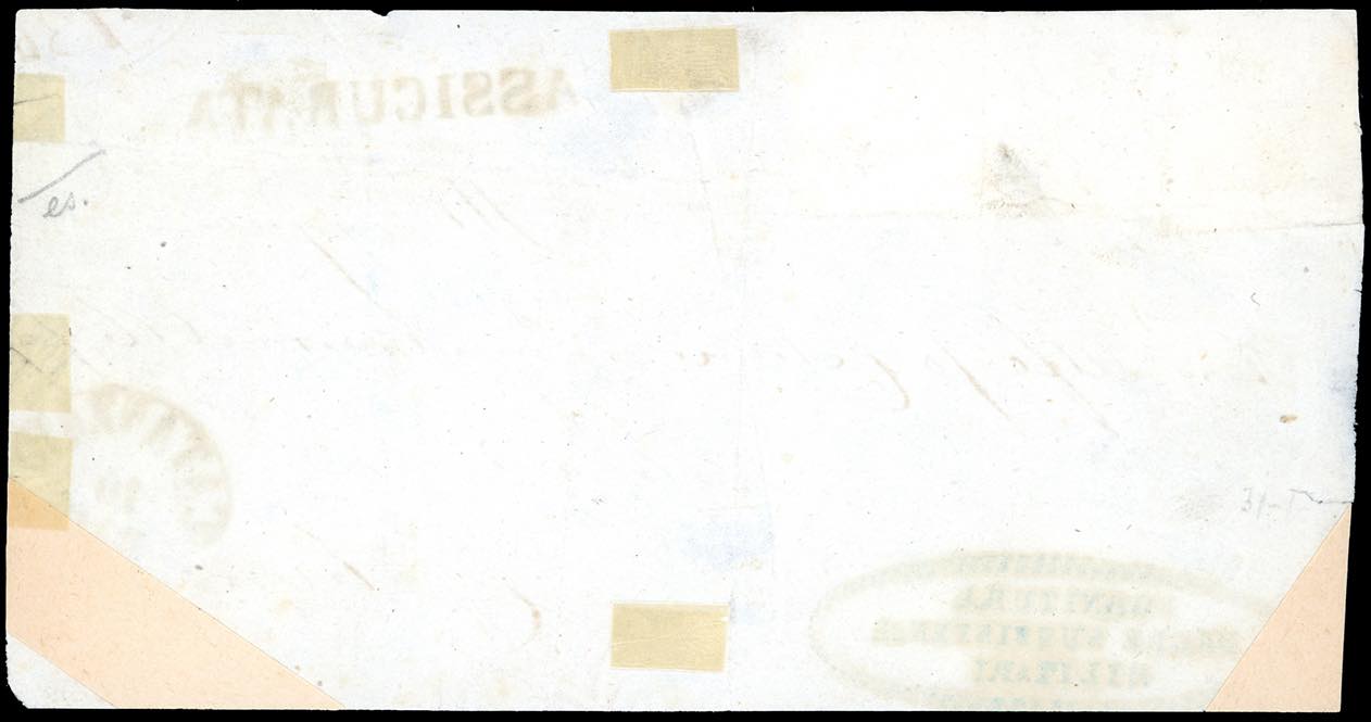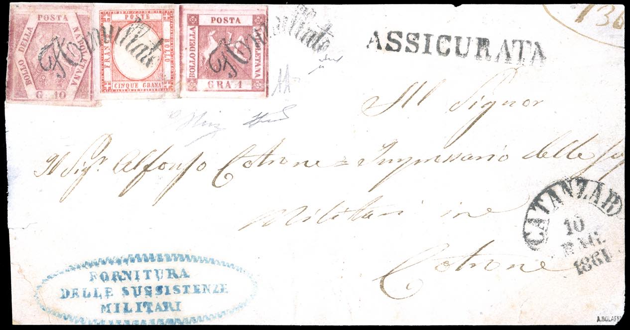 1861 - 1 grano carminio, II tavola, 10 grana carminio rosa, II tavola (4a,11), in affrancatura mista con 5 grana vermiglio (21a), su frontespizio di lettera assicurata da Catanzaro 10/5/1861, annullo a svolazzo, a Cotrone. Affrancatura mista estremamente rara e di ottimo aspetto. A.Diena, G.Oliva, Chiavarello, cert. Ferrario. Ex coll. Imperato.