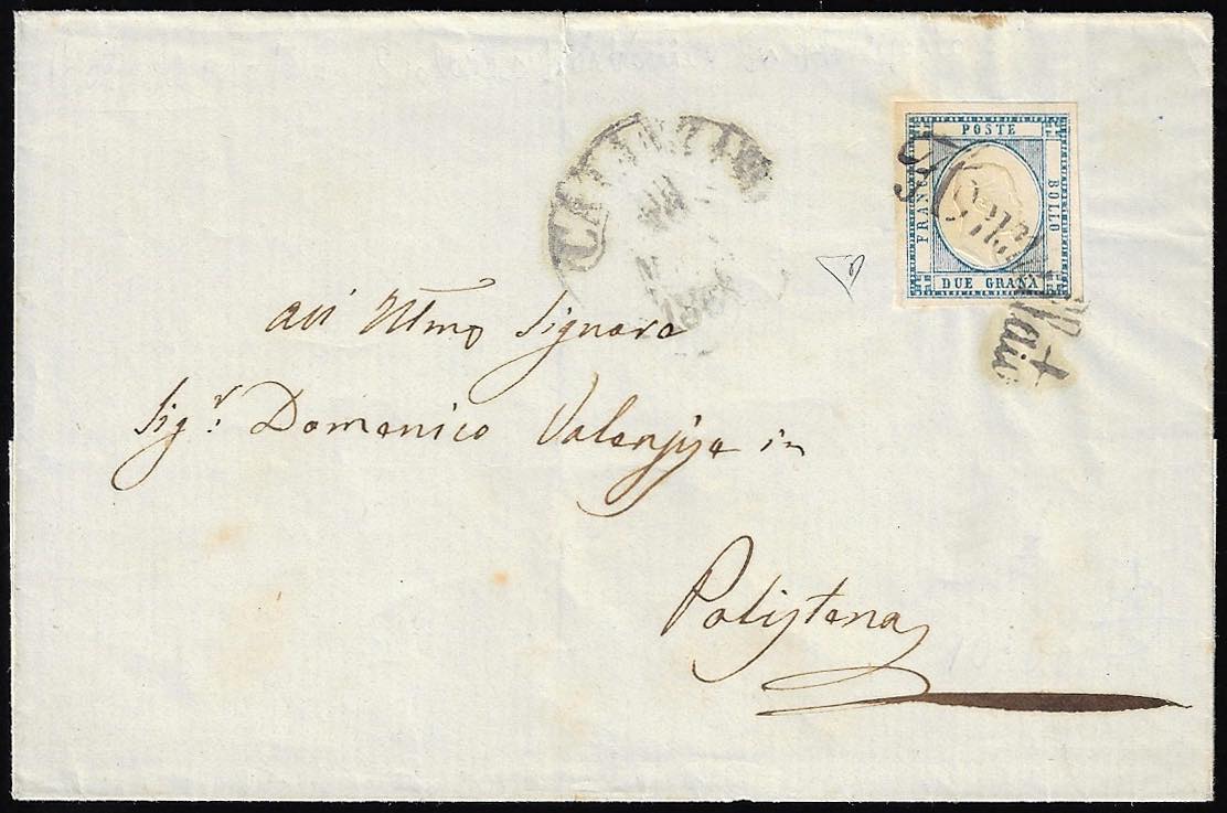 CATANZARO, svolazzo + cerchio punti 11 - 2 grana (20), perfetto, su sovracoperta di lettera del 26/3/1861 a Polistena. Molto bella. E.Diena.