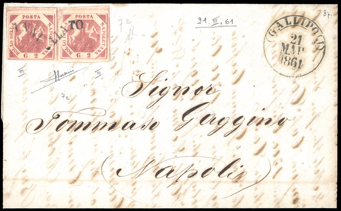 GALLIPOLI, svolazzo + cerchio punti 8 - 2 grana (7e), due esemplari, perfetti, su lettera di doppio porto del 21/3/1861 per Napoli. ... Leggi tutto