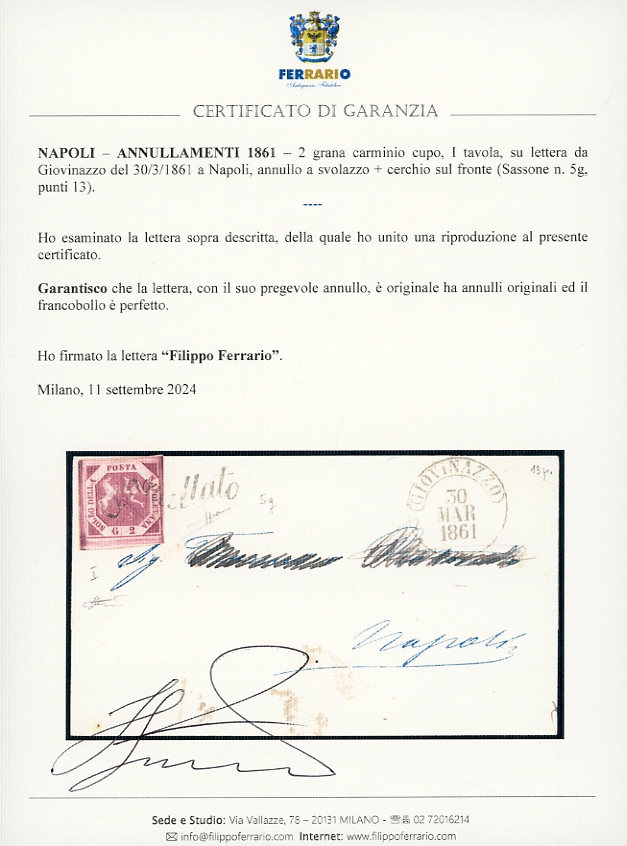 GIOVINAZZO, svolazzo + cerchio punti 13 - 2 grana carminio cupo, I tavola (5g), perfetto e di colore molto intenso, su lettera del 30/3/1861 per Napoli. Rara. Sorani, cert. Ferrario.