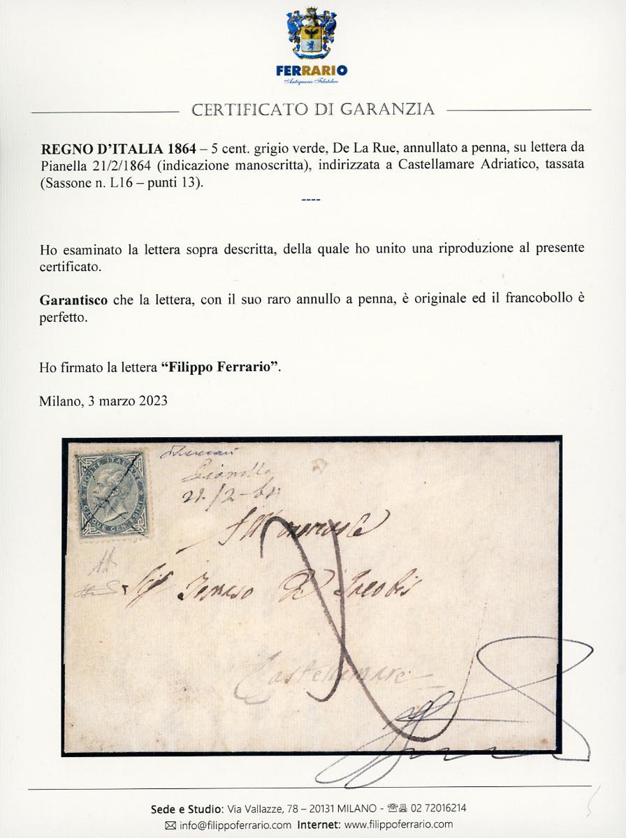 PIANELLA, a penna punti 13 - 5 cent. De La Rue (L16), perfetto, su lettera del 21/2/1864 per Castellamare Adriatico. Rarità del settore, il catalogo Sassone segnala una sola lettera nota con questo annullo. A.Diena, Vaccari, cert. Ferrario.
