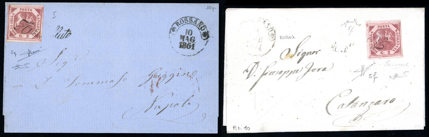 ROSSANO, svolazzo + cerchio punti 10 - Lotto di due lettere: 2 grana (5g), perfetto, su fresca lettera del 10/5/1861 per Napoli; 2 grana (5f), perfetto su lettera del marzo 1861, svolazzo opposto capovolto, per Catanzaro. Molto belle. Sorani, Ferrario.
