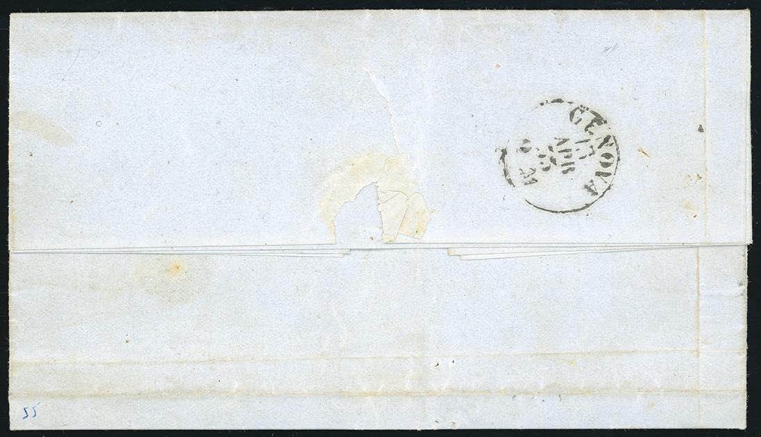 1855 - 10 cent. bianco (2), due strisce di tre, la prima, ben marginata e perfetta, applicata su una piega preesistente della lettera, la seconda con margini da completi a giusti, su lettera di doppio porto da Parma 11/4/1855 a Genova. Rarissima affrancatura multipla monovalore di cui si conoscono pochissimi casi. A.Diena, Chiavarello, cert. Ferrario.