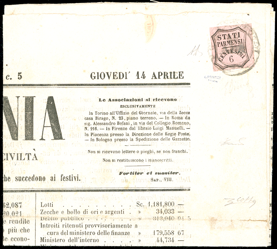 1859 - 6 cent. rosa vivo (1), perfetto e ben marginato, su giornale L'Armonia del 14/4/1859 annullato in arrivo a Pontremoli. Molto raro. Em. ed A.Diena, Ferrario, cert. Colla.