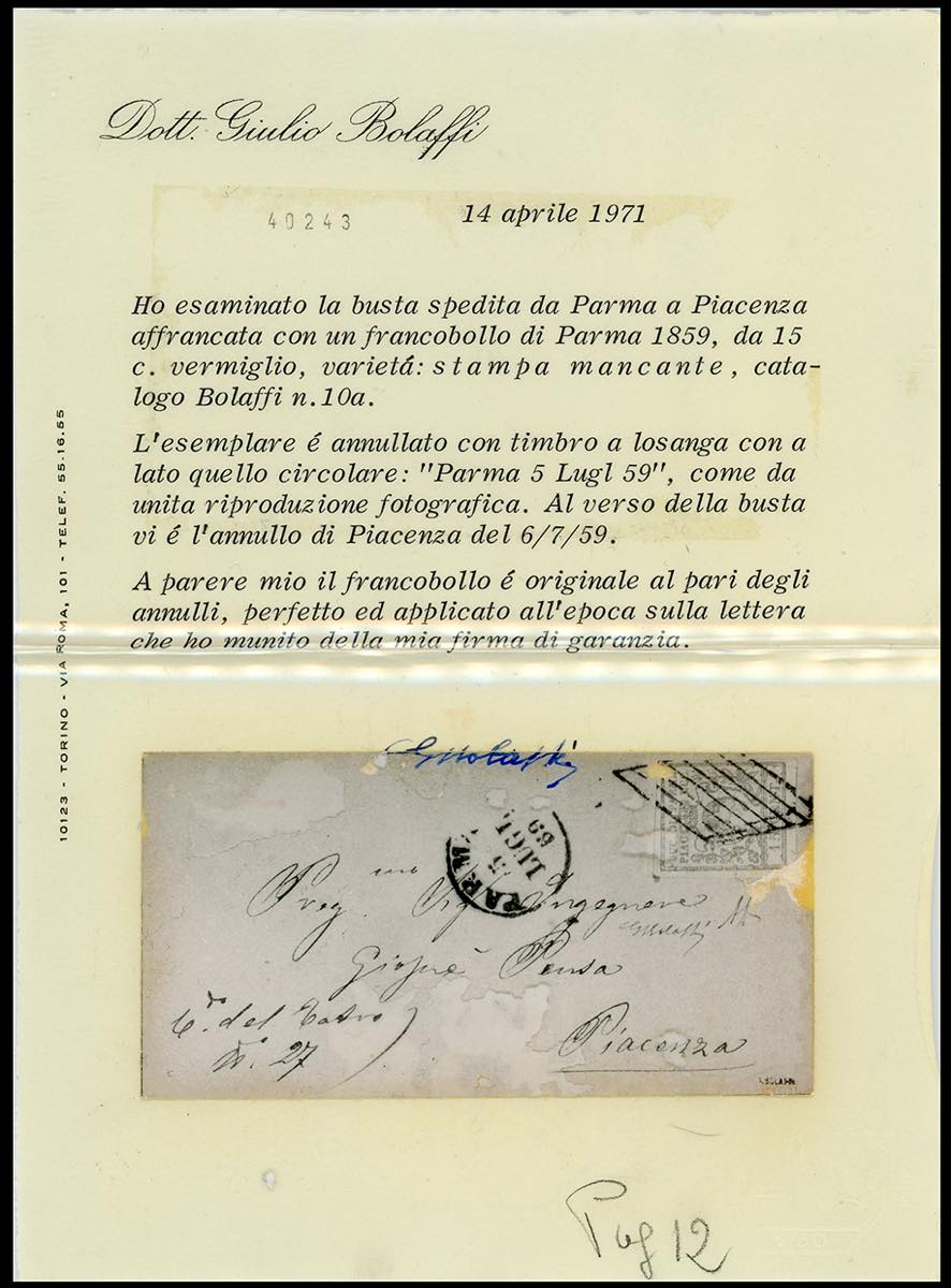 1859 - 15 cent. vermiglio, varietà stampa mancante (9), perfetto, su fresca lettera da Parma 5/7/1859 a Piacenza, in periodo di Governo Provvisorio. Bellissima ed appariscente. A.Diena, Ferrario, cert. G.Bolaffi.