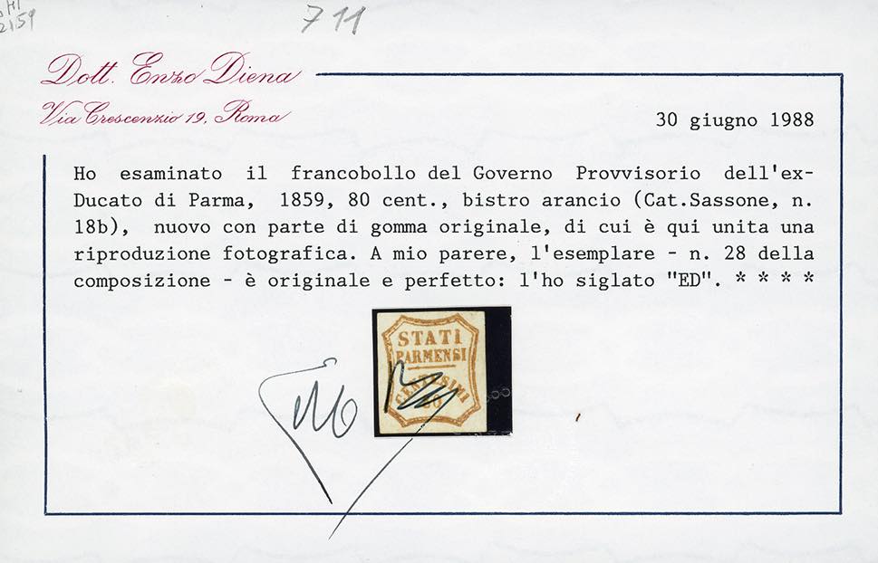 1859 - 80 cent. bistro arancio, varietà di clichè, posizione 28 (18b), gomma originale, perfetto. Raro. A.Diena, cert. E.Diena.