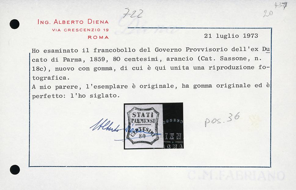 1859 - 80 cent. arancio, varietà di clichè, posizione 36 (18c), gomma originale, perfetto e ben marginato. Fresco e molto bello. Em.Diena, cert. A.Diena.