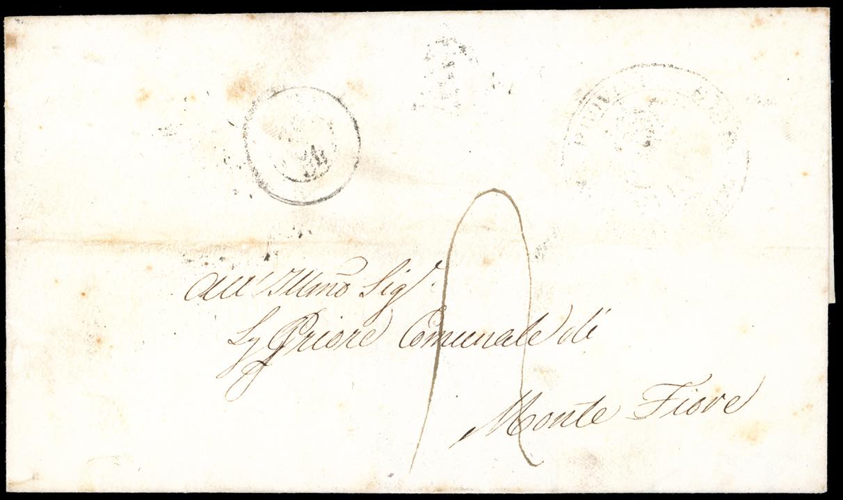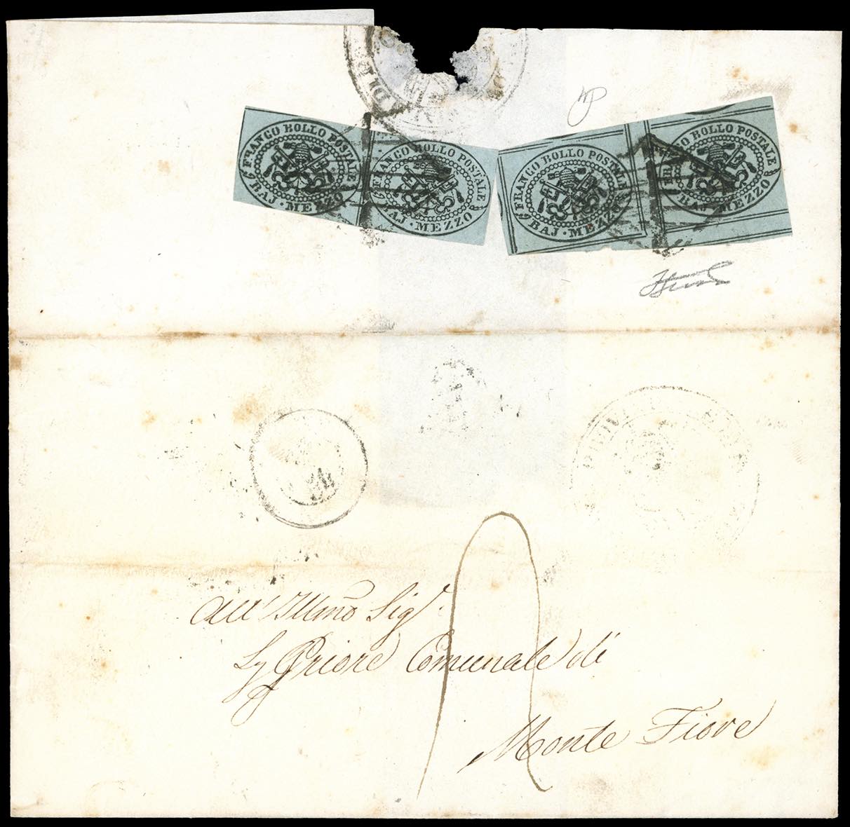 1854 - 1/2 baj grigio azzurro, due coppie orizzontali, una con interspazio verticale completo al centro e gran parte di quello orizzontale in basso "cuore del foglio", al verso di lettera di doppio porto assegnato da Rimini 9/7/1854 a Monte Fiore. INSIEME UNICO! Ferrario. Ex coll. Imperato.