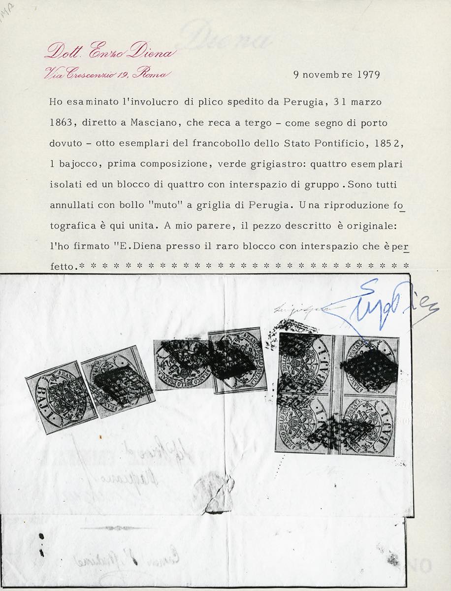 1853 - 1 baj verde grigiastro (2), blocco di quattro con interspazio orizzontale di gruppo al centro, perfetto e con filetti completi su tutti i lati, e quattro esemplari singoli, al verso di fresca lettera di otto porti, in porto assegnato, da Perugia 31/3/1853, francobolli annullati con il muto a griglietta, a Marsciano. UNICA AFFRANCATURA COSI' COMPOSTA FINORA NOTA, di eccezionale impatto visivo. Rarità da esposizione. G.Oliva, A.Diena, cert. E.Diena e Ferrario. Ex coll. Imperato.