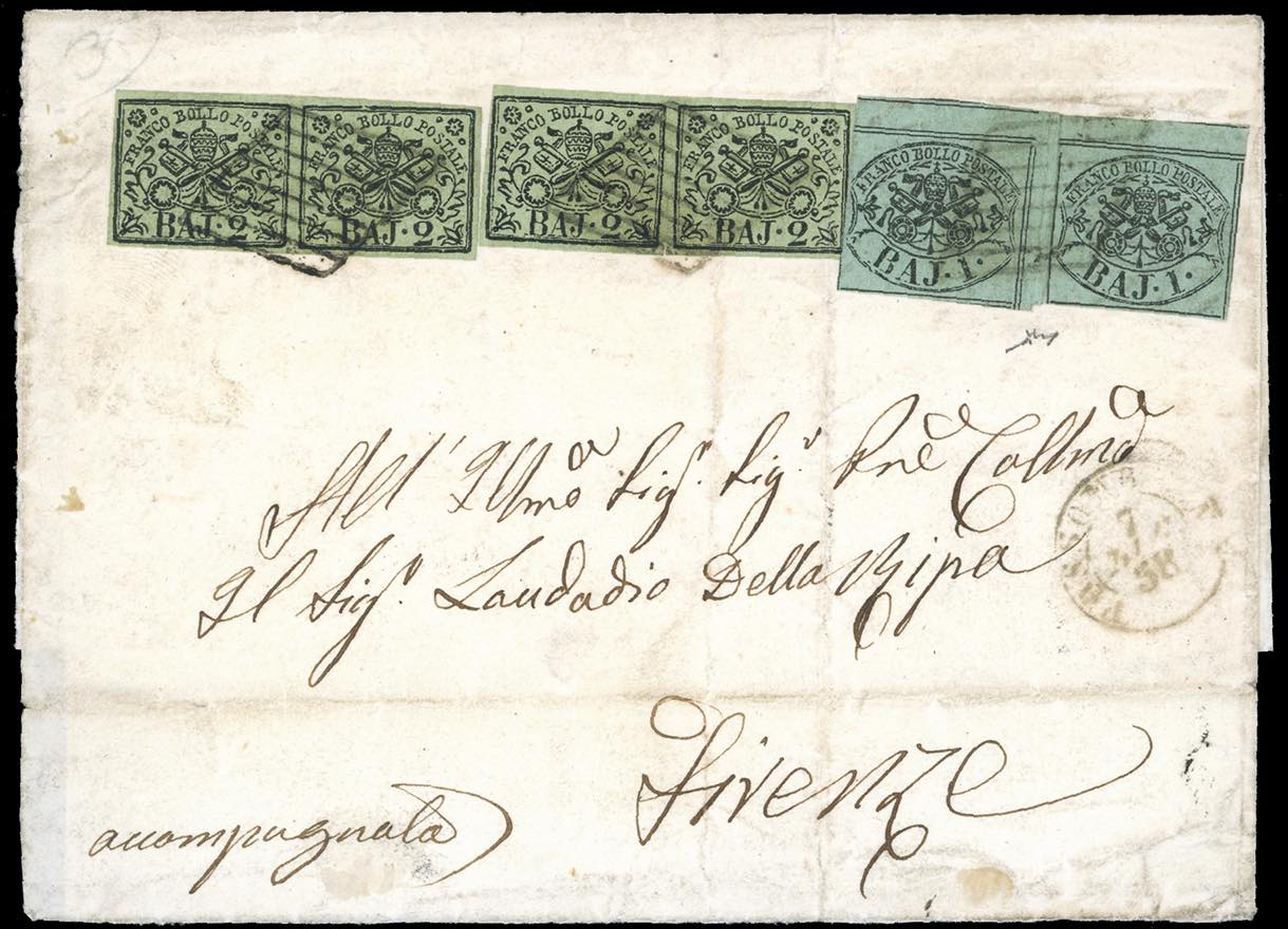 1858 - 1 baj verde grigiastro, due esemplari uno con interspazio verticale, l'altro orizzontale, 2 baj verde oliva (2,3), due coppie, su lettera da Fossombrone 7/12/1858 a Firenze. Tutti i francobolli hanno ottimi margini, lieve piega verticale su un esemplare della seconda coppia. Appariscente e non comune affrancatura multipla. Chiavarello. Ex coll. Imperato.