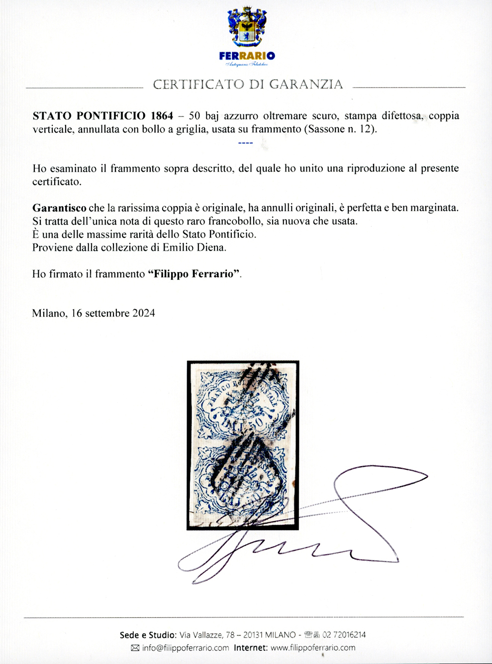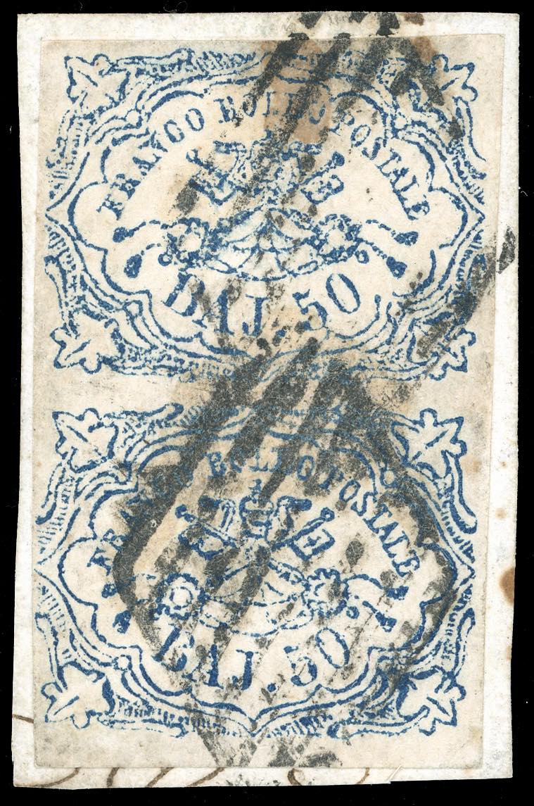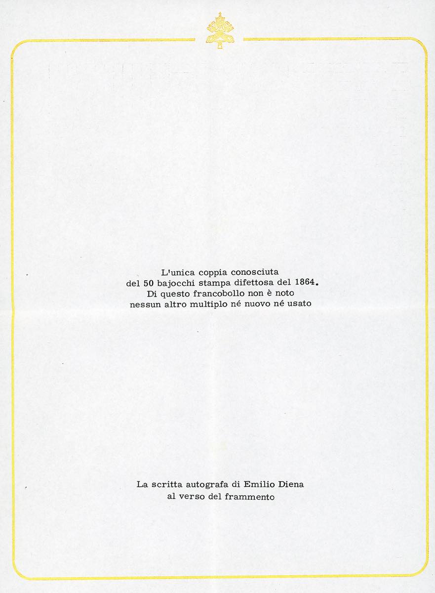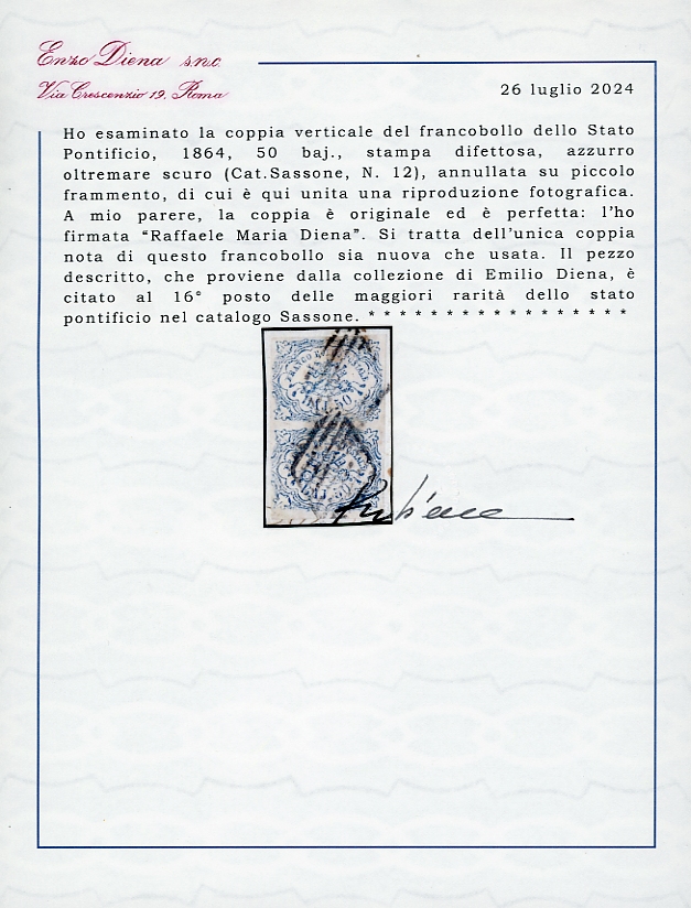 1864 - 50 baj azzurro oltremare scuro, stampa difettosa (12), coppia verticale, perfetta e ben marginata, usata su frammento. UNICA NOTA di questo raro francobollo, sia nuova che usata. Citata al 16° posto delle maggiori rarità dello Stato Pontificio. Rarità assoluta in splendide condizioni qualitative, già esposta nelle più prestigiose sedi. Annotazione autografa di Emilio Diena al verso, cert. R.Diena e Ferrario. Ex collezione Emilio Diena.