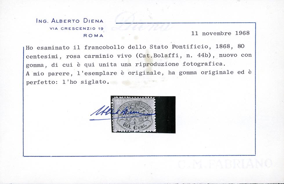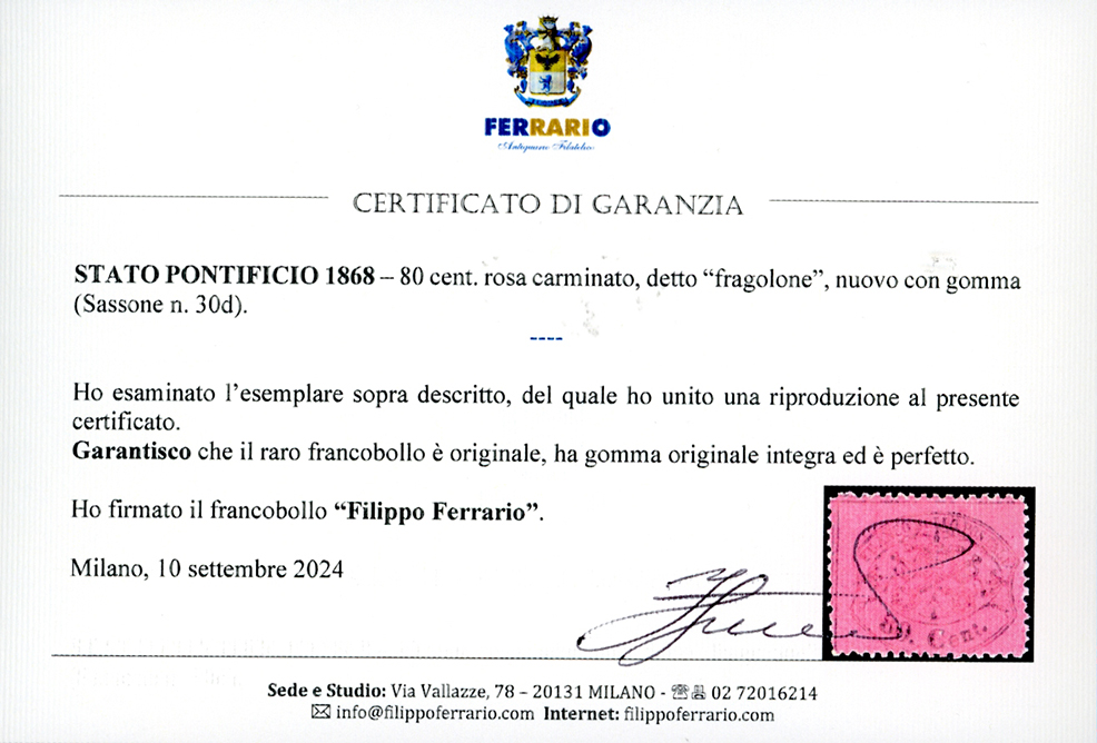 1868 - 80 cent. rosa carminato, Fragolone (30d), nuovo, gomma originale integra, perfetto. Freschissimo e di colore vivo. Pochi esistenti con gomma integra. G.Bolaffi, cert. Alberto Diena e Ferrario.