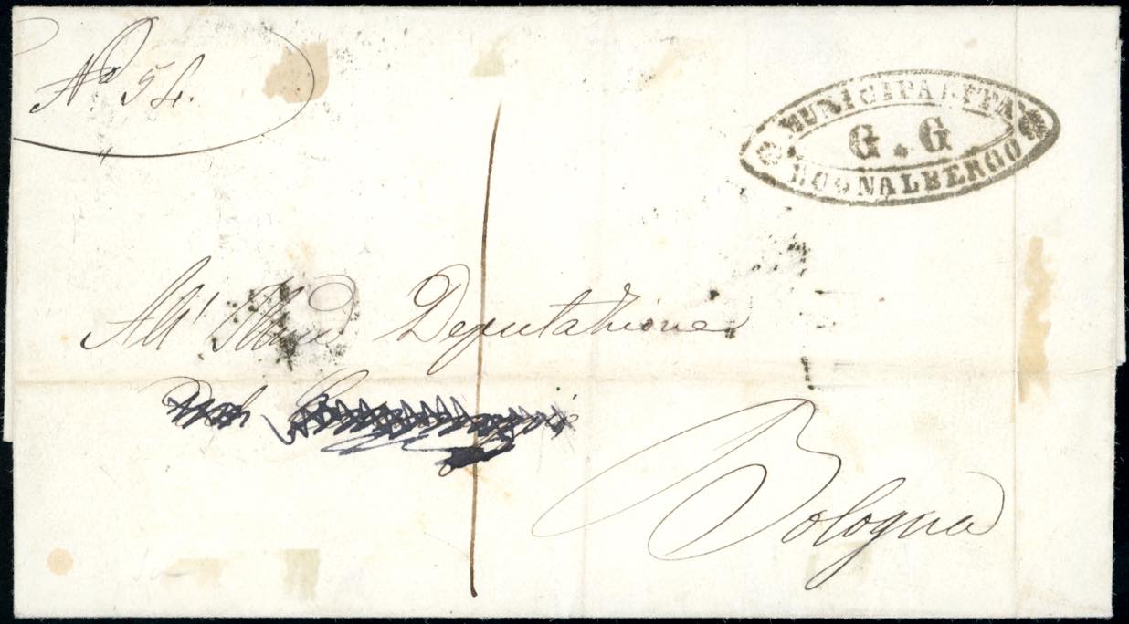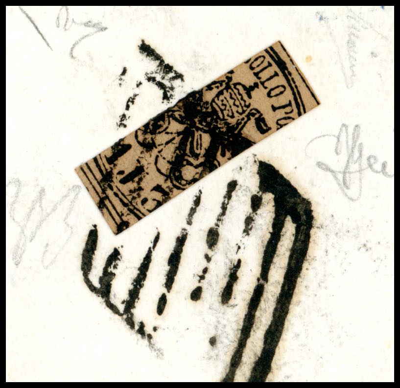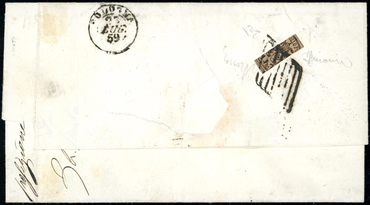 1859 - 3 baj bruno (4Aa), frazionato ad 1/3, sezione centrale, al verso di sovracoperta di lettera in porto assegnato per Bologna ... Leggi tutto