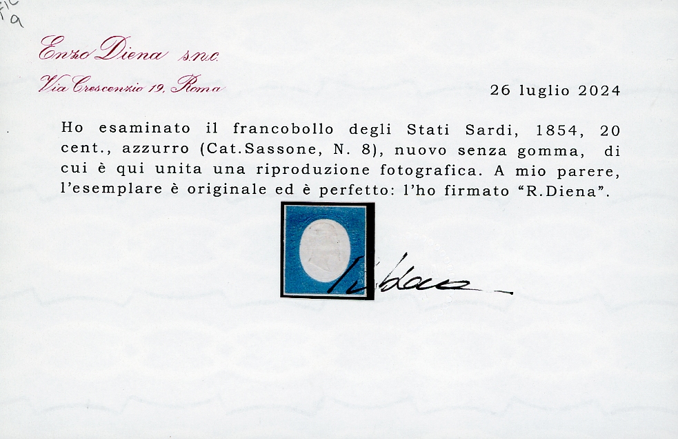 1854 - 20 cent. azzurro (8), nuovo senza gomma, perfetto e molto fresco. Raro. Emilio e Alberto Diena, cert. R.Diena.