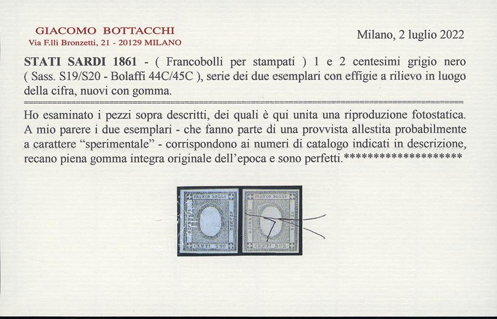 1861 - 1 cent. grigio nero e 2 cent. grigio nero per stampati, entrambi con l'effigie di Vittorio Emanuele II al posto della cifra, francobolli sperimentali (19S,20S), gomma originale integra, perfetti e molto freschi. Rari e di ottima qualità. Cert. Bottacchi, fotocopia cert. Diena della coppia di provenienza dell'1 cent.