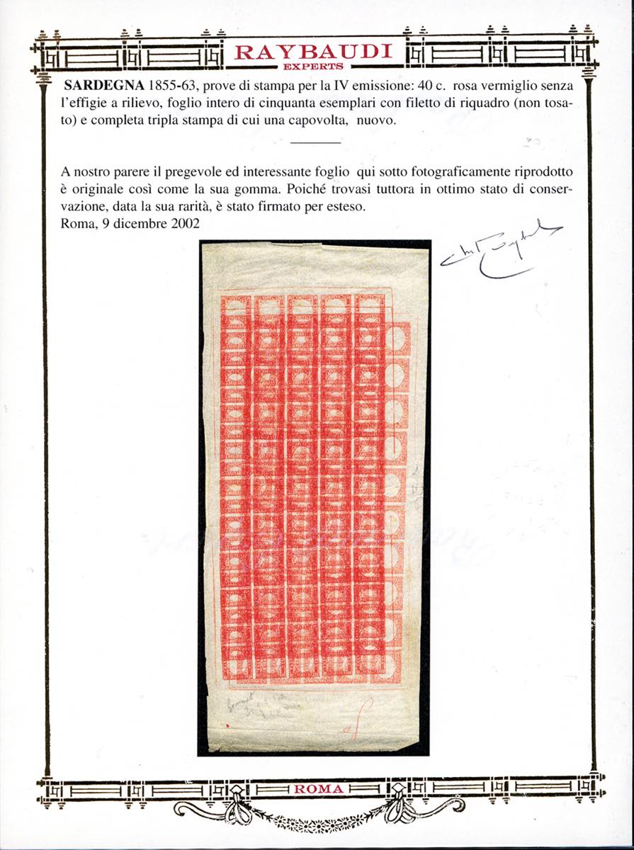 1863 - 40 cent. rosa vermiglio (16F), senza effigie, foglio completo di 50 esemplari con filetto di riquadro, margini non tosati, tripla stampa completa, gomma integra, piega orizzontale che interessa cinque francobolli. Molto raro, probabilmente unico! Cert. Oro Raybaudi.