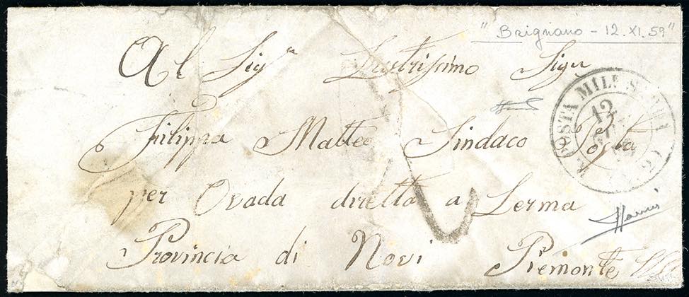 1859 - Lettera non affrancata scritta a Brignano 12/11/1859 e affidata alla R.Posta Militare Sarda n. 2 per Lerma, tassata 20 cent. Interessante e non comune. Sorani, Ferrario.