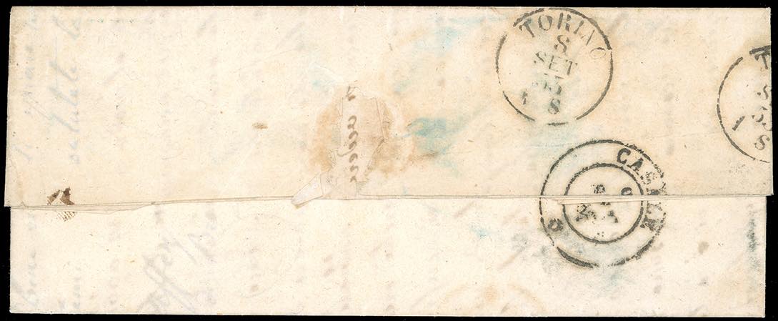 PIEMONTE-BRUSASCO, punti 13 - 20 cent. (2), perfetto, su lettera del 7/9/1853 per Casale. Rara. Cert. E.Diena e Sorani.