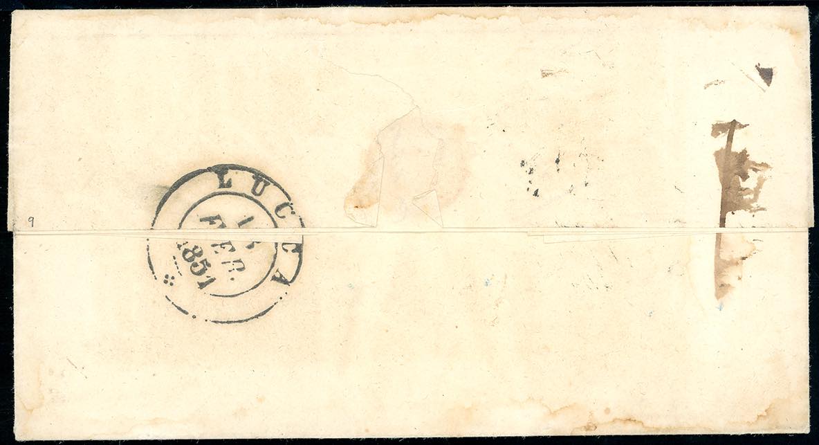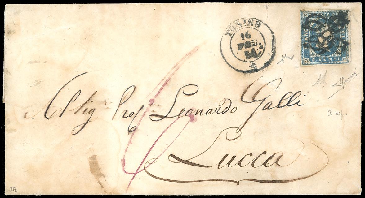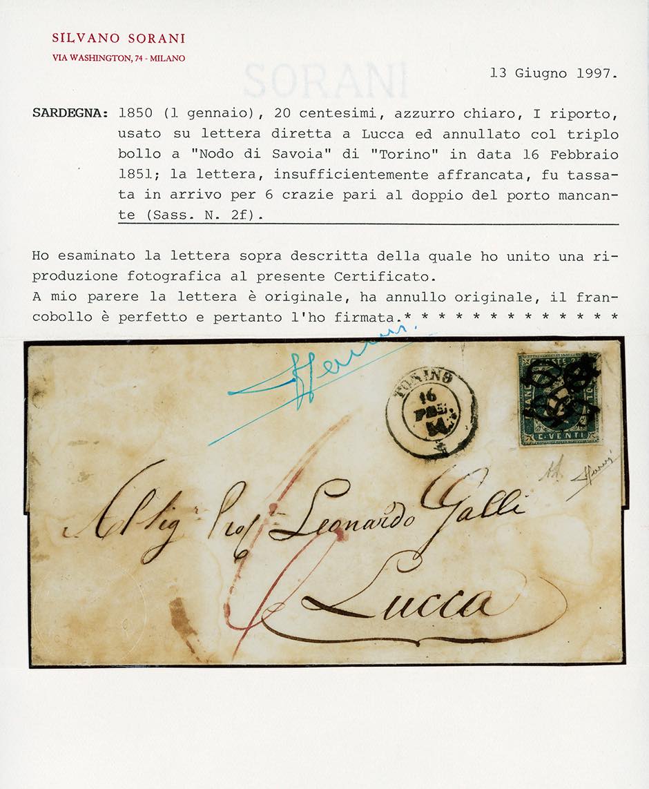 PIEMONTE-TORINO, nodo di Savoia ripetuto 3 volte punti 11++ - 20 cent, azzurro chiaro (2f), perfetto, su lettera del 16/2/1851 per Lucca, affrancata fino al confine per assenza di Convenzione postale e tassata 6 crazie in arrivo. Interessante e raro insieme. A.Diena, Chiavarello, cert. Sorani. Ex coll. Imperato.