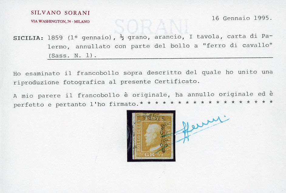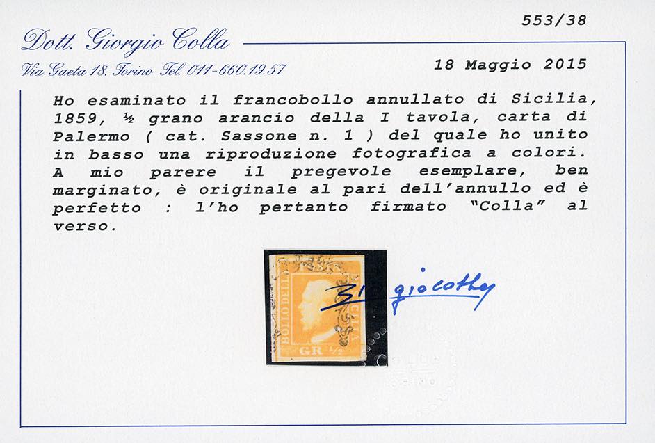 1859 - 1/2 grano arancio, I tavola, carta di Palermo (1), perfetto, margini eccezionali, usato. Splendido, qualità superiore. Golinelli, Ferrario, cert. Colla e Sorani.