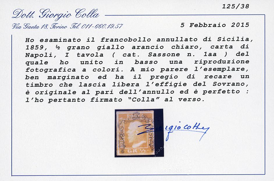 1859 - 1/2 grano giallo arancio chiaro, I tavola, carta di Napoli (1aa), perfetto e ben marginato, usato con annullo a ferro di cavallo in posizione ideale e che lascia scoperta l'effigie. Splendida qualità. G.Bolaffi, Mezzadri, A.Diena, Fiecchi, Ferrario, cert. Colla.