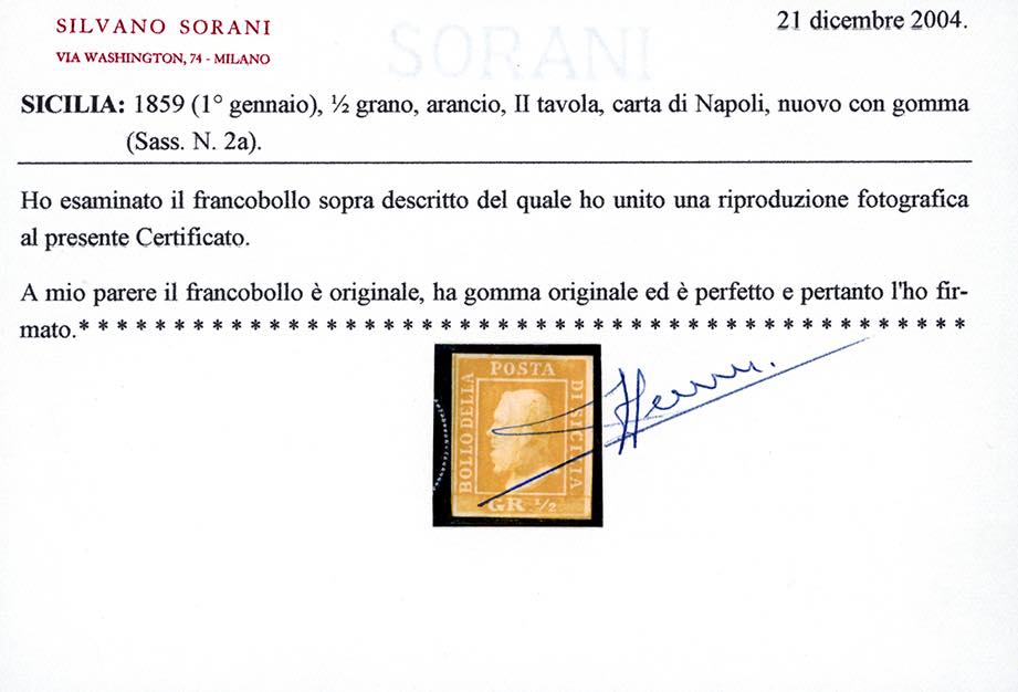 1859 - 1/2 grano arancio, II tavola, carta di Napoli (2a), gomma originale, perfetto e ben marginato. Molto fresco, ottima qualità. Ferrario, cert. Sorani.
