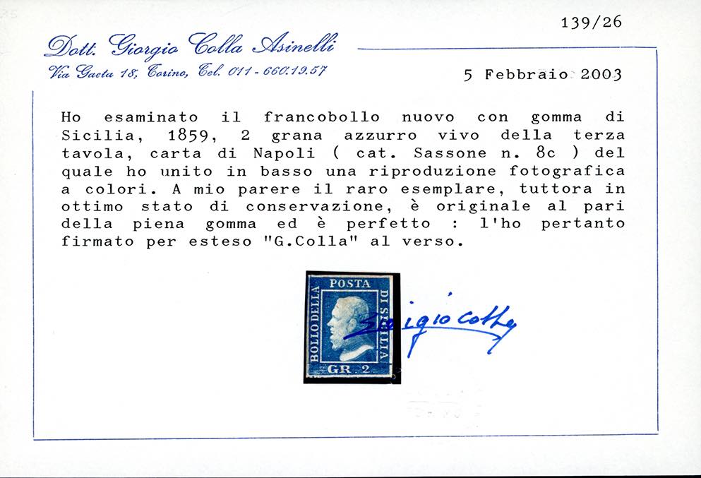 1859 - 2 grana azzurro vivo, III tavola, carta di Napoli (8c), gomma originale, perfetto e molto fresco. Splendido e raro. Em. ed A.Diena, cert. E.Diena e Colla.
