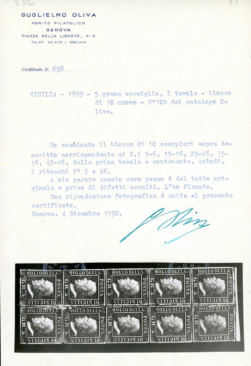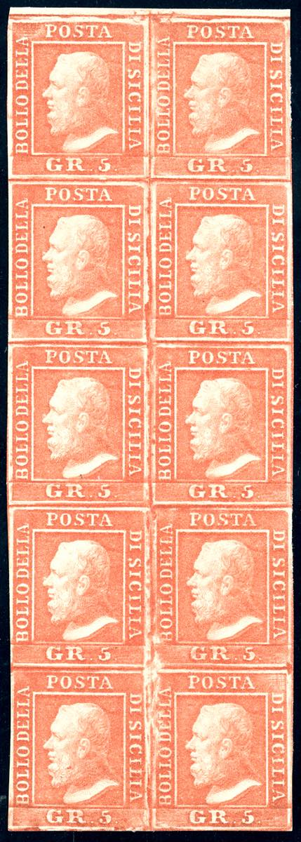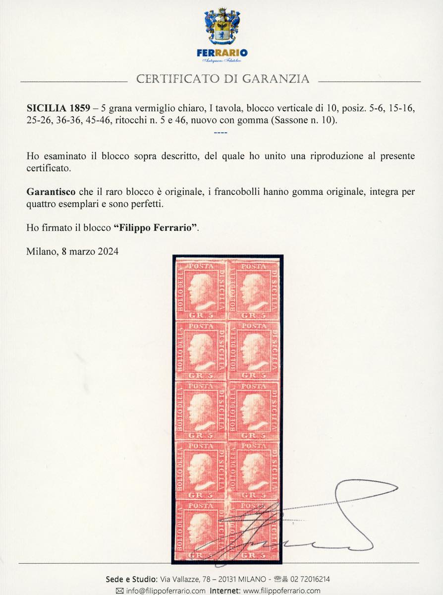 1959 - 5 grana vermiglio chiaro, I tavola (10), blocco verticale di 10, posiz. 5-6, 15-16, 25-26, 36-36, 45-46, ritocchi n. 5 e 46, gomma originale, integra per quattro esemplari, perfetto e molto fresco. Eccezionale e molto raro. A.Diena, cert. G.Oliva e Ferrario.