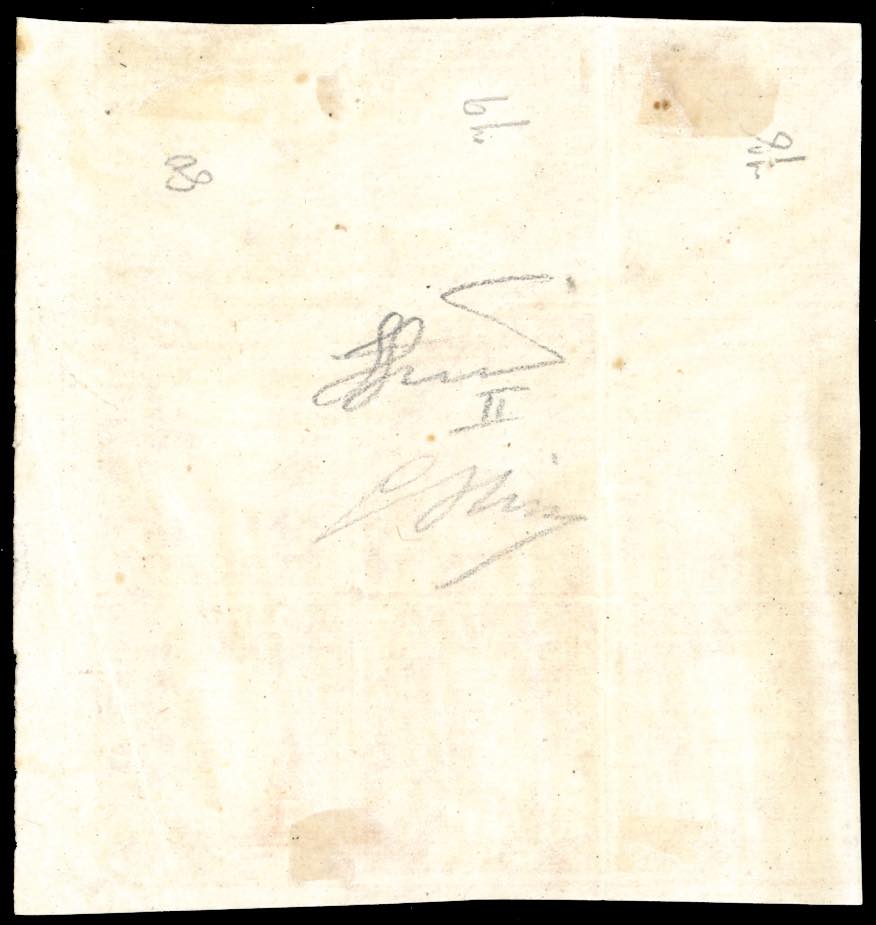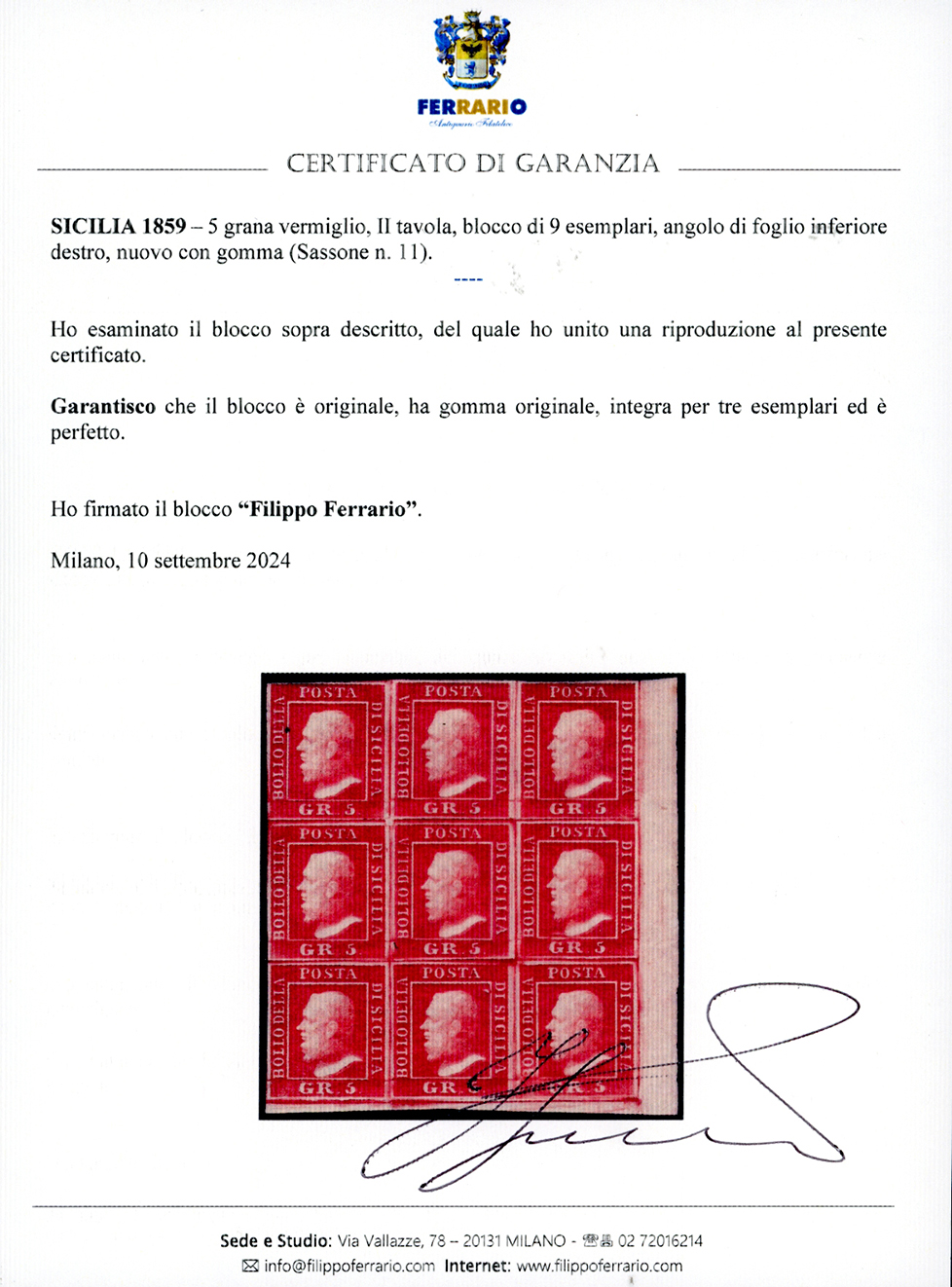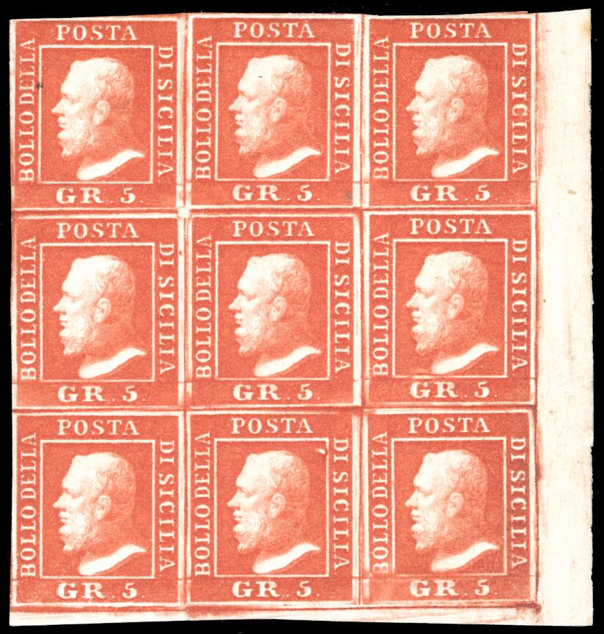 1859 - 5 grana vermiglio, II tavola (11), blocco di nove esemplari, angolo di foglio, gomma originale, integra per tre esemplari, perfetto e molto fresco. Ottima qualità. G.Oliva, cert. Ferrario.