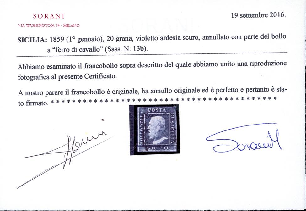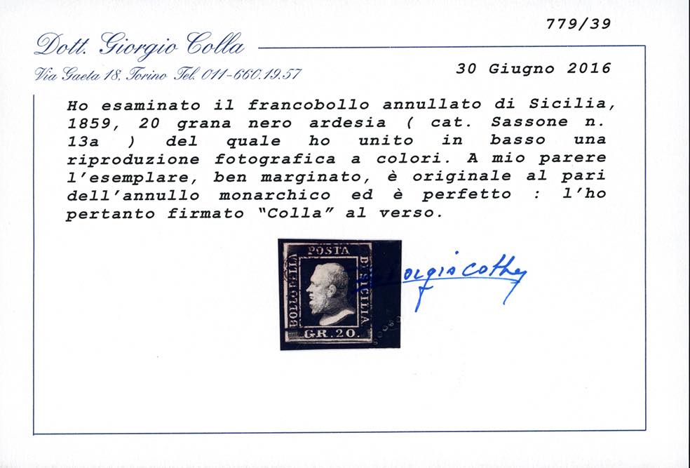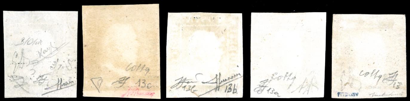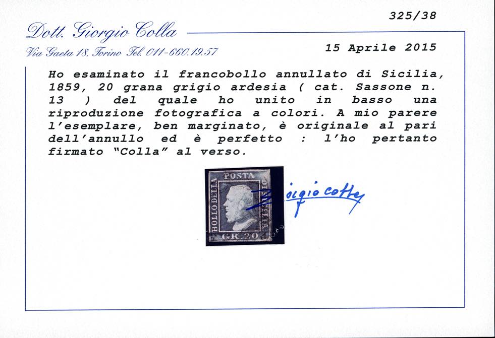 1859 - 20 grana, cinque esemplari nelle differenti tonalità di colore censite dal catalogo Sassone (13,13a,13b,13c,13d), usati, perfetti e di qualità selezionata. Tutti firmati e classificati da noti periti, tre cert. Colla e due Sorani.