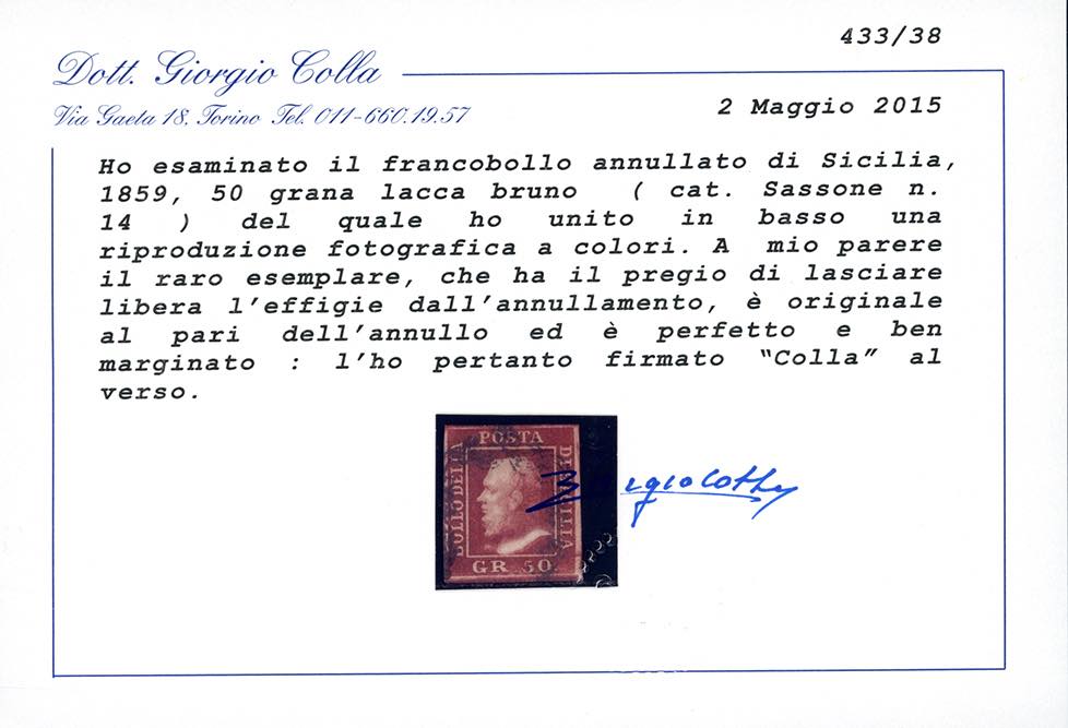 1859 - 50 grana lacca bruno (14), testa d'avorio al verso, usato, perfetto. Molto bello. Fiecchi. Ferrario, cert. E.Diena e Colla.
