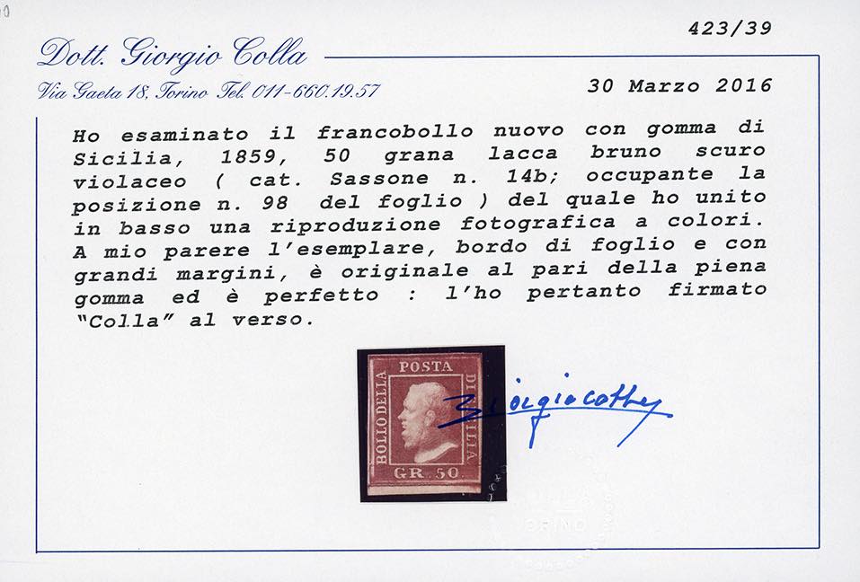 1859 - 50 grana lacca bruno scuro violaceo, pos. 98 (14b), piccolo bordo di foglio in basso, gomma originale, perfetto e ben marginato. Molto bello. Ferrario, cert. Colla e Sorani.