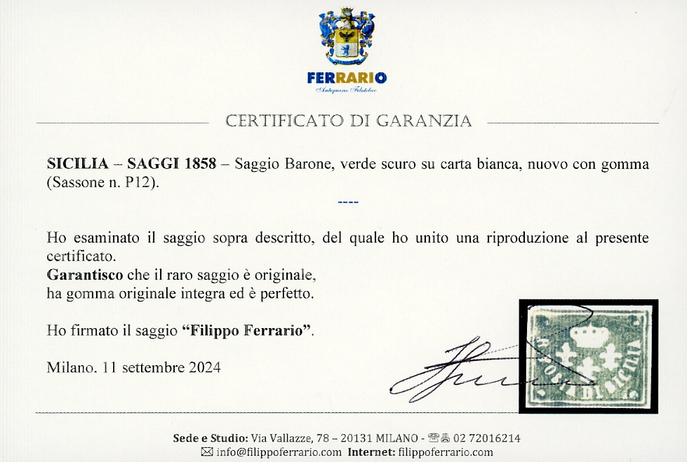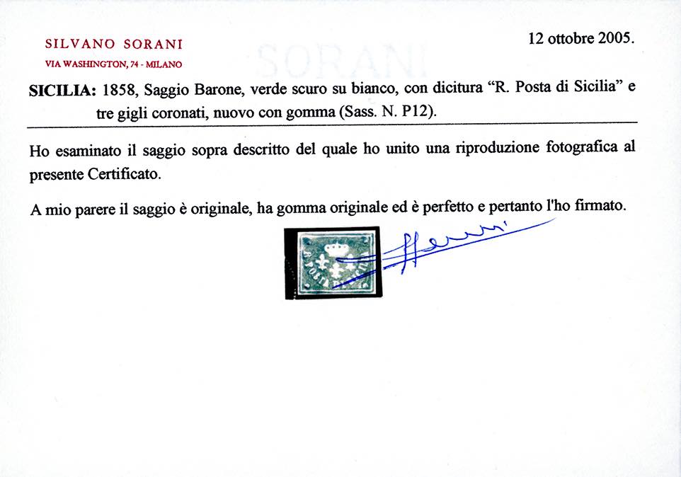 1858 - Saggio Barone, verde scuro su carta bianca (P12), gomma originale integra, perfetto e molto fresco. Raro. Cert. Sorani e Ferrario.