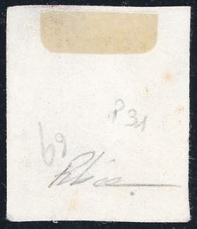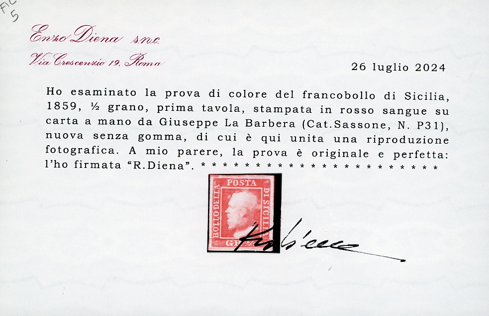1858 - 1/2 grano rosso sangue, prova di colore di G.La Barbera e F.Lao su carta a mano (P31), senza gomma, perfetta e ben marginata, molto fresca. Molto rara e di ottima qualità. Poche esistenti. Cert. Diena. Ex collezione Emilio Diena.
