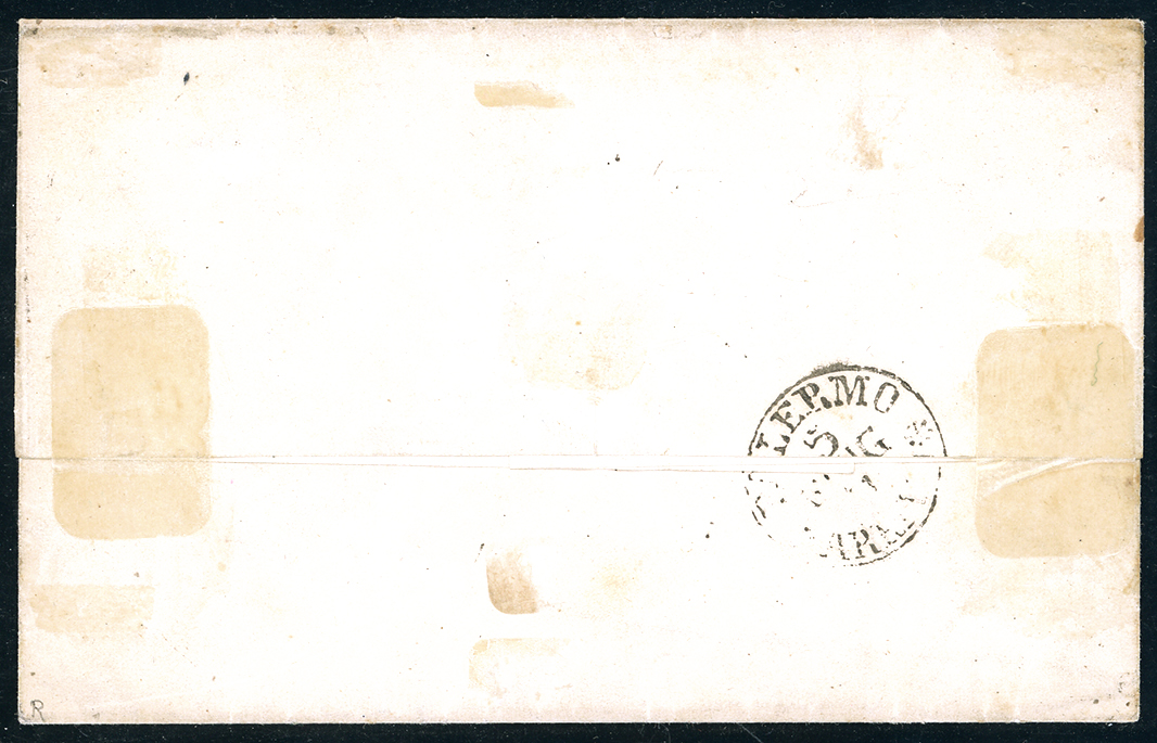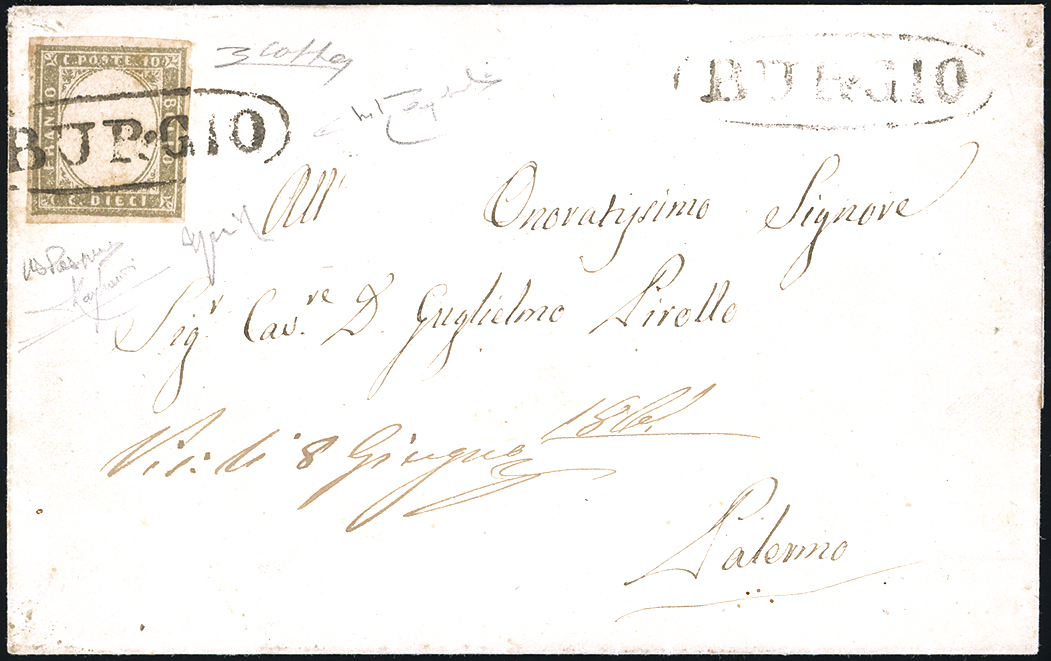 BURGIO, ovale senza fregi, punti R2 - 10 cent. (14C), perfetto, su fresca lettera diretta a Palermo il 5/6/1861. Splendida, forse la più bella lettera recante tale annullo borbonico su Sardegna. Luigi e Maurizio Raybaudi, G.Colla, ex collez. Nino Aquila.