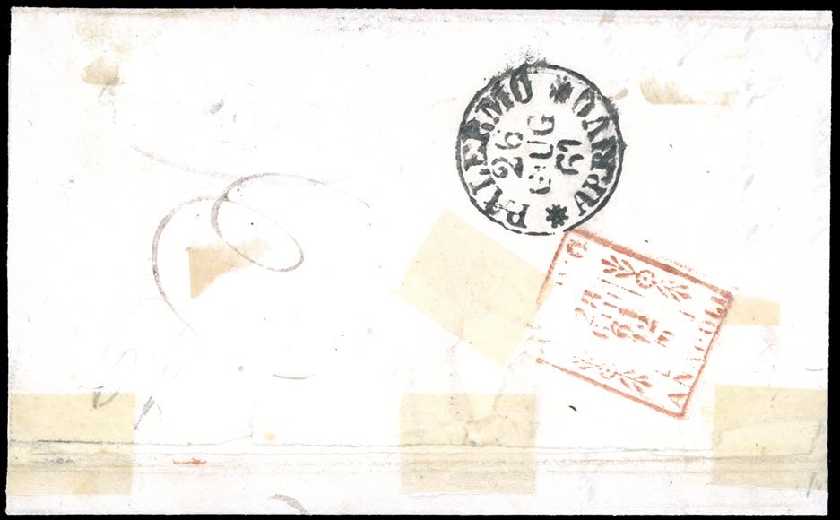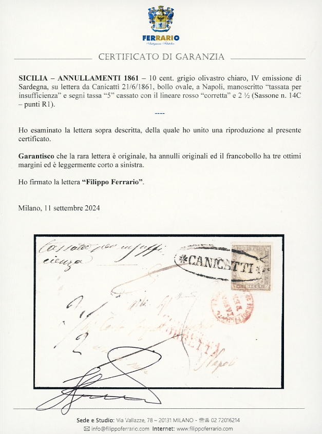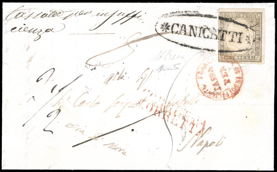 CANICATTI', ovale punti R1 - 10 cent. IV emissione di Sardegna (14C), tre ottimi margini, leggermente intaccato a sinistra, su lettera del 21/6/1861 per Napoli, manoscritto "tassata per insufficienza" e segno di tassa "5" cassato con il lineare rosso "corretta" e 2 1/2. Rara. A.Diena, cert. Ferrario.