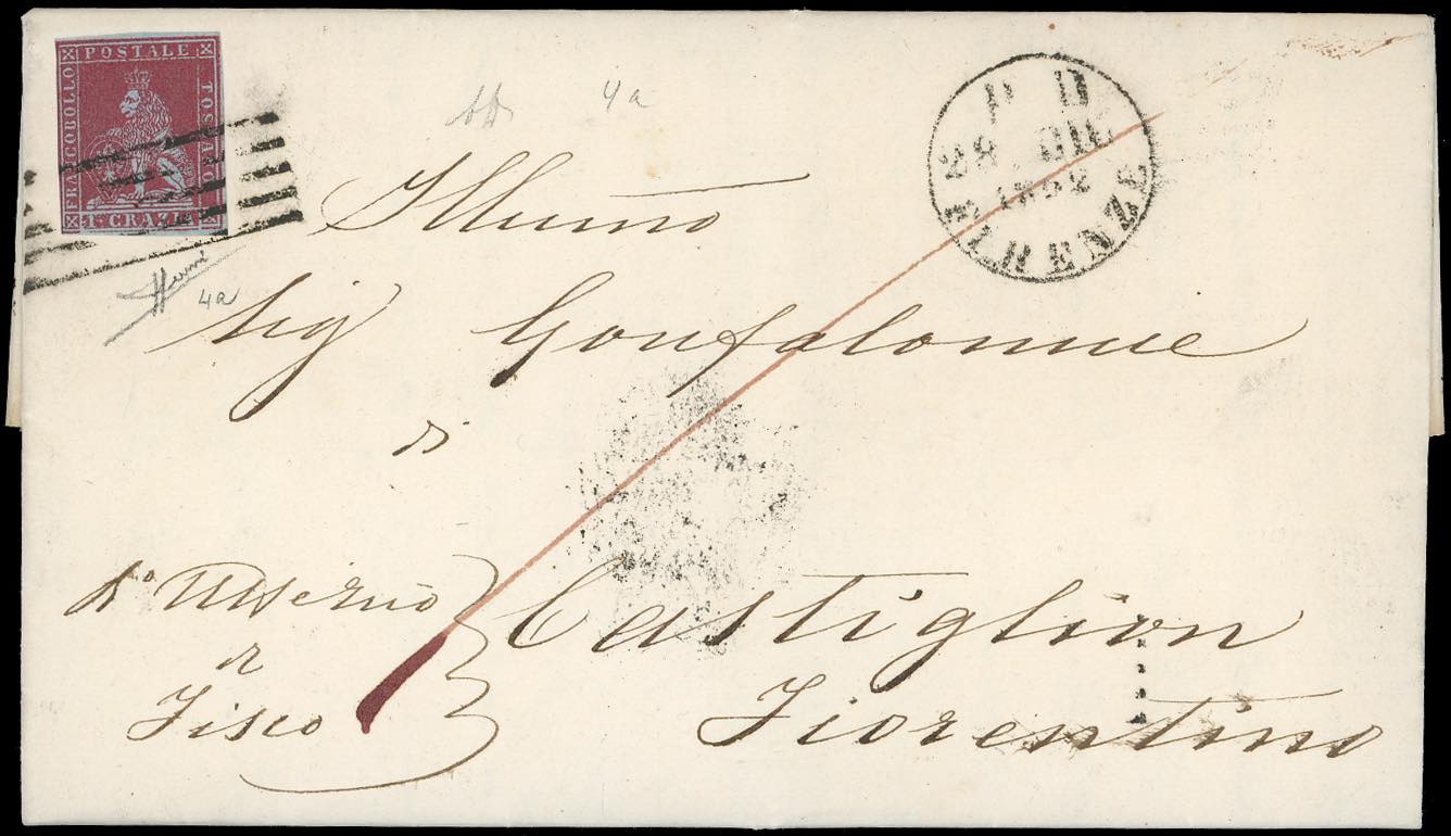 1852 - 1 crazia carminio cupo su azzurro (4a), appena sfiorato a sinistra, isolato su lettera da Firenze 28/12/1852 a Castiglion ... Leggi tutto