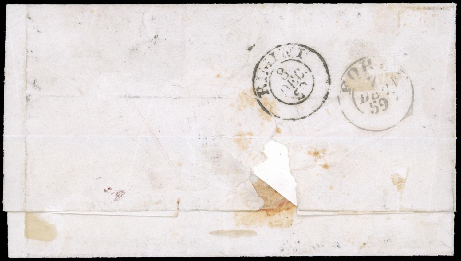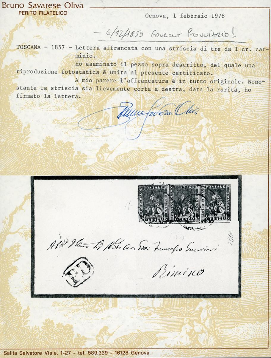 1859 - 1 crazia carminio, II emissione (12), striscia orizzontale di tre, appena sfiorata a sinistra, su lettera da Firenze 6/12/1859 a Rimini, durante il Governo Provvisorio. Non comune. Emilio e Alberto Diena, cert. Oliva.