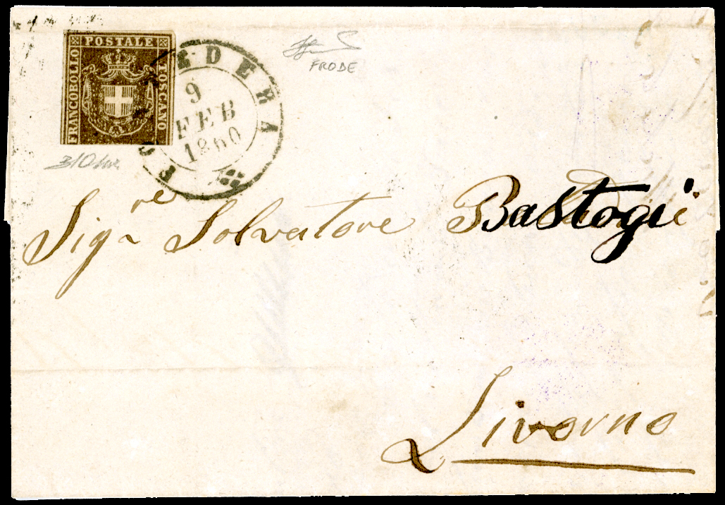 1860 - 10 cent. bruno grigio (19c), parte inferiore del francobollo con il tassello del valore completamente asportata, tre ampi margini bianchi sugli altri lati, su lettera da Pontedera 9/2/1860 a Livorno. Interessante e rara FRODE POSTALE, con l'asportazione della porzione precedentemente annullata del francobollo. Cert. Ferrario e Oliva.
