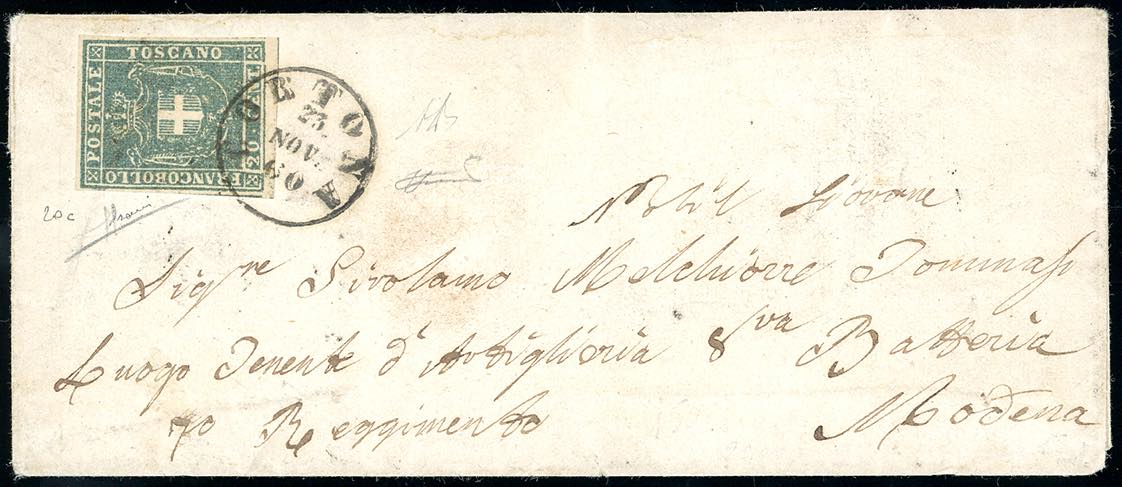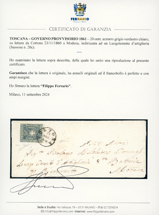 1860 - 20 cent. azzurro grigio verdastro chiaro (20c), perfetto e con ampi margini, su lettera da Cortona 23/11/1860 a Modena, indirizzata ad un Luogotenente d'Artiglieria. Interessante e di ottima qualità. A.Diena, Sorani, cert. Ferrario.