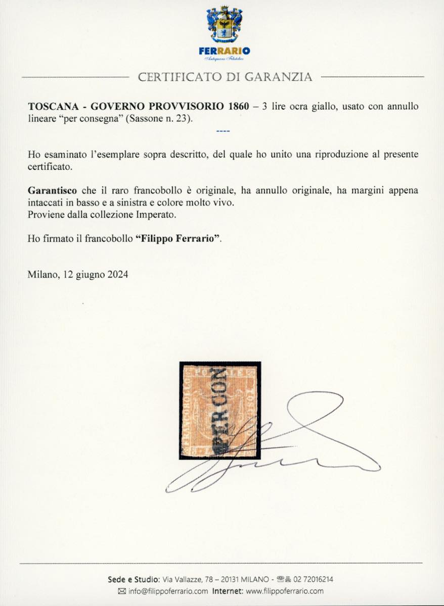 1860 - 3 lire ocra giallo (23), appena intaccato nel margine inferiore e in quello sinistro, molto fresco nel colore e di buona conservazione complessiva, usato con il lineare "per consegna". Rarità classica dell'Area Italiana, di ottimo aspetto. Cert. AIEP Bottacchi e Ferrario. Ex coll. Imperato.