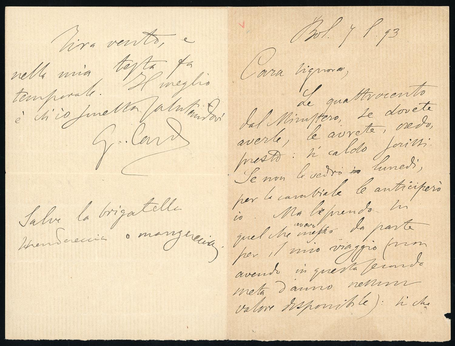 CARDUCCI - Lettera autografa di quattro facciate a firma Giosuè Carducci, datata Bologna 7/7/1893.