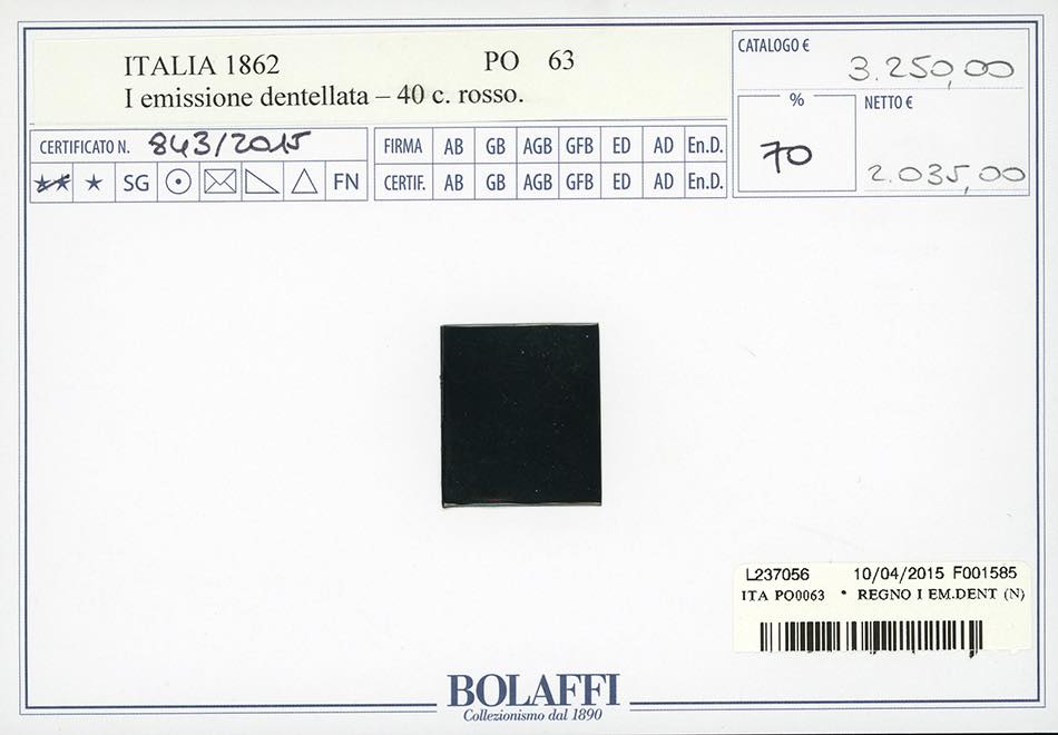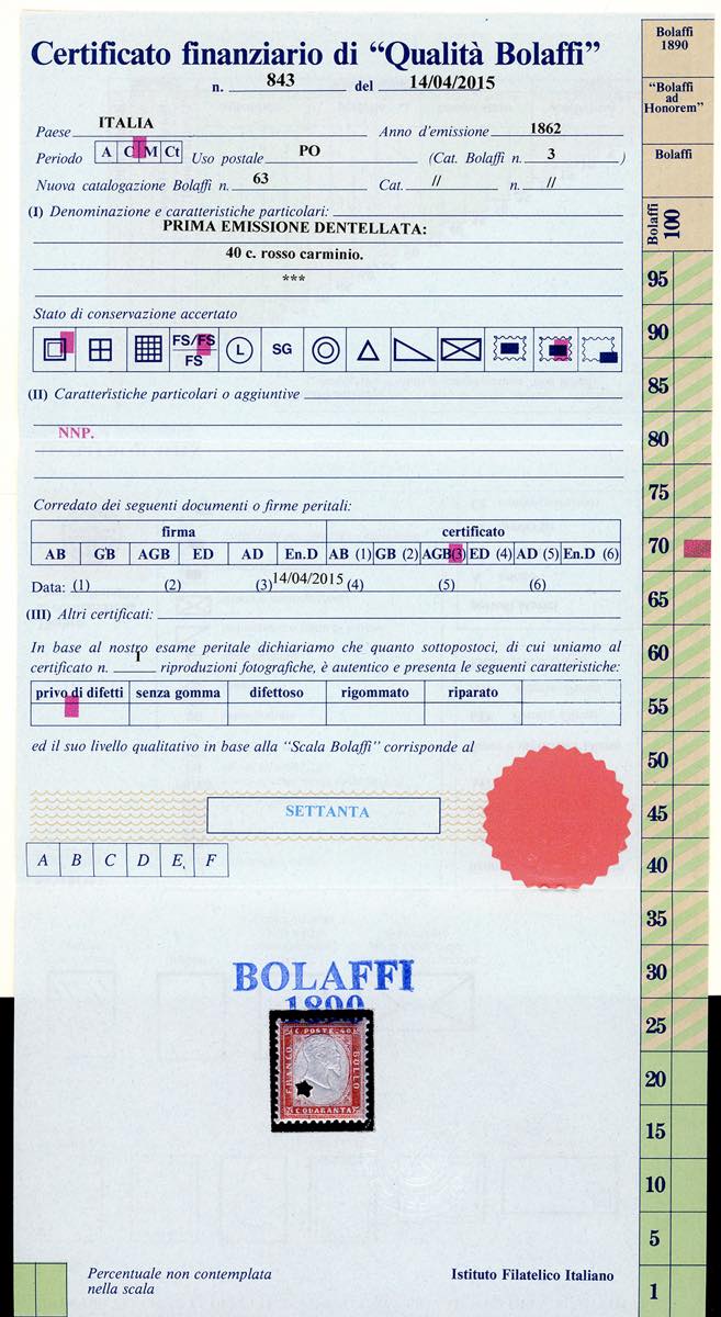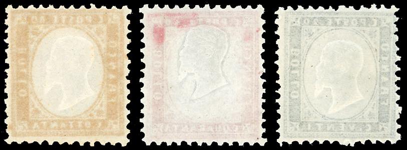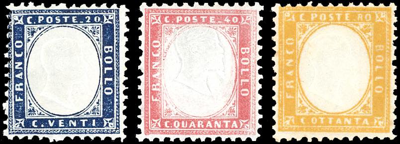 1862 - 20, 40 e 80 cent. (2,3,4), nuovi, gomma originale integra, perfetti. Bellissimi. Il 40 cent. cert. Finanziario Bolaffi 70%.