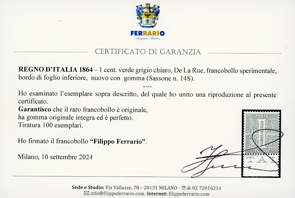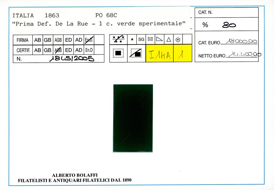 1864 -1 cent. verde grigio chiaro, De La Rue, FRANCOBOLLO SPERIMENTALE (14S), bordo di foglio inferiore, gomma originale integra, perfetto. ... Leggi tutto