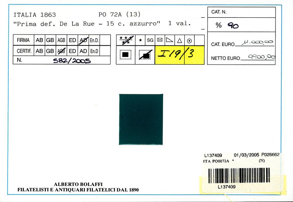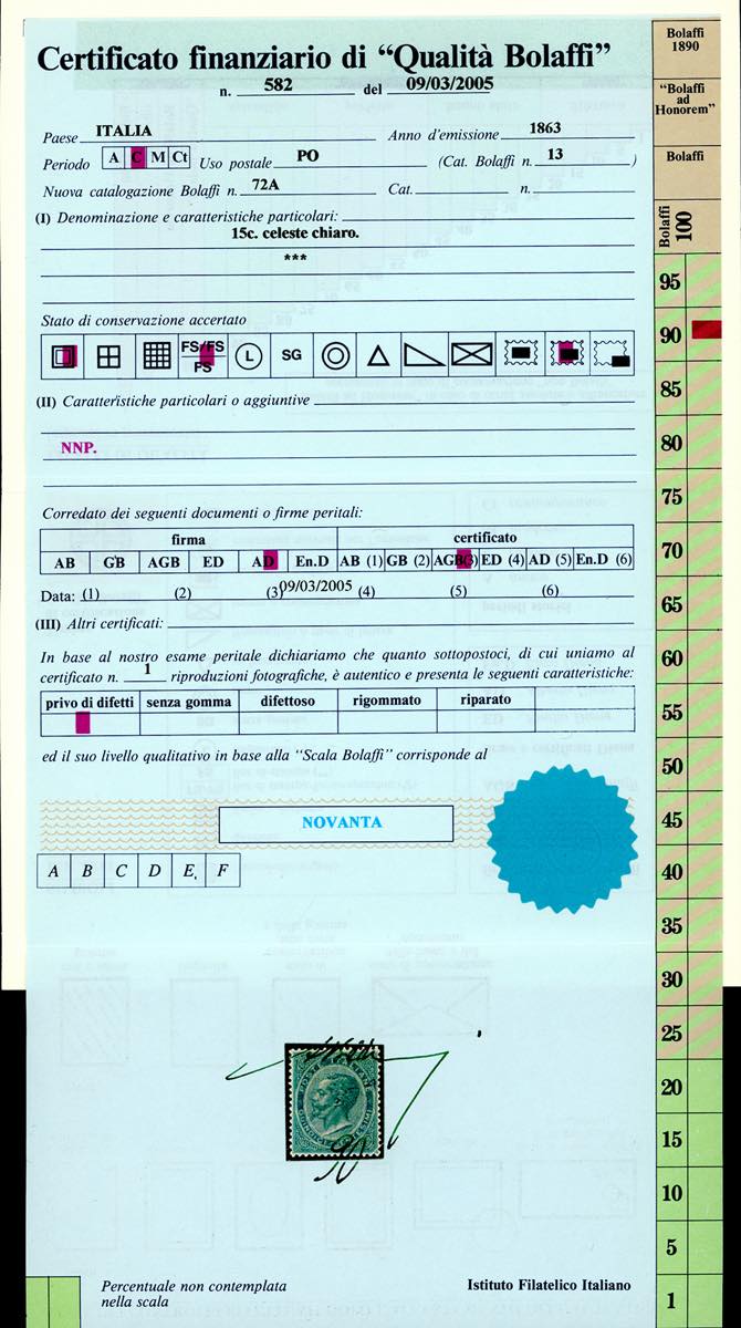 1863 - 15 cent. De La Rue (L18b), nuovo, gomma originale integra, perfetto. Splendido per freschezza e centratura. Molto raro di questa qualità. A.Diena, cert. Finanziario Bolaffi 90%.